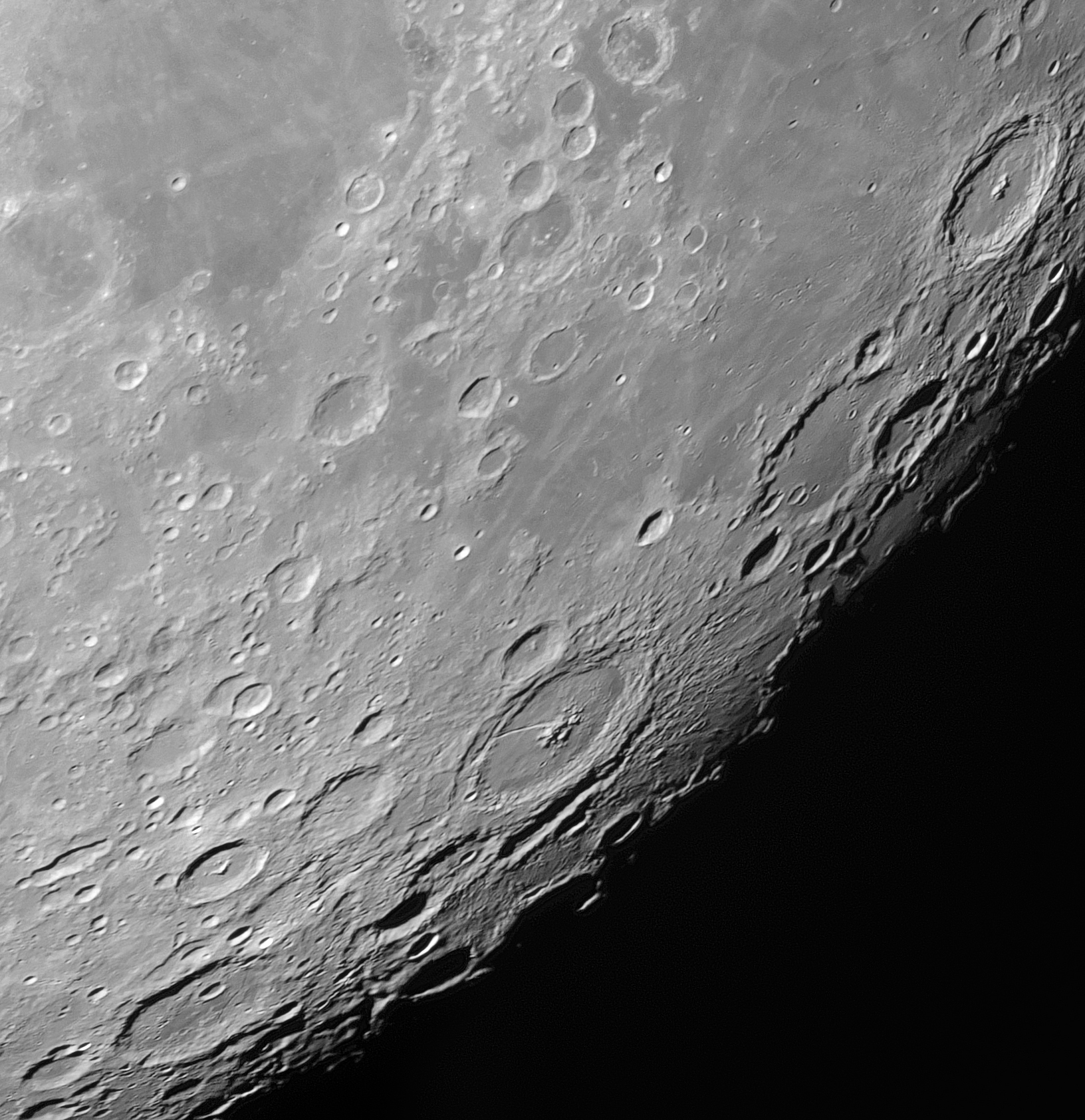 Zwei Giganten des östlichen Mondrands: Langrenus und Petavius. Beide sind reichlich mit Rillen versehen. Ihre Ejekta verteilen sich grundverschieden über den Marebasalt: Langrenus hat nach Süden, Petavius nach Norden ausgeworfen. Panorama aus zwei Bildern.