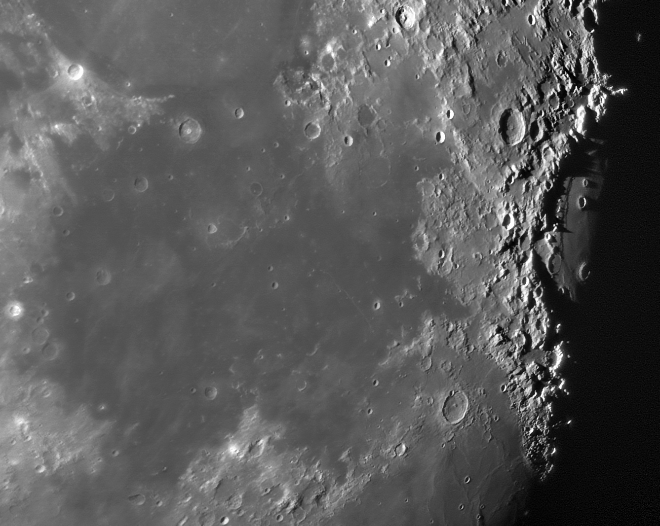 Das Bild bietet eigentlich nichts Besonderes, die Qualität stimmt nicht ganz wegen des im Sommer häufig nur passablen Seeings. Deshalb möchte ich Ihre Aufmerksamkeit auf den rechten Bildrand lenken. Zu sehen sind die äussersten, westlichen Ausläufer des Mare Crisium. Zwischen Wall und Krater Yerkes befindet sich ein vulkanischer Dom (Y1). Die unterschiedlich hohen Wallränder werfen schöne, kurze bis sehr lange Schatten ins Meer der Gefahren.