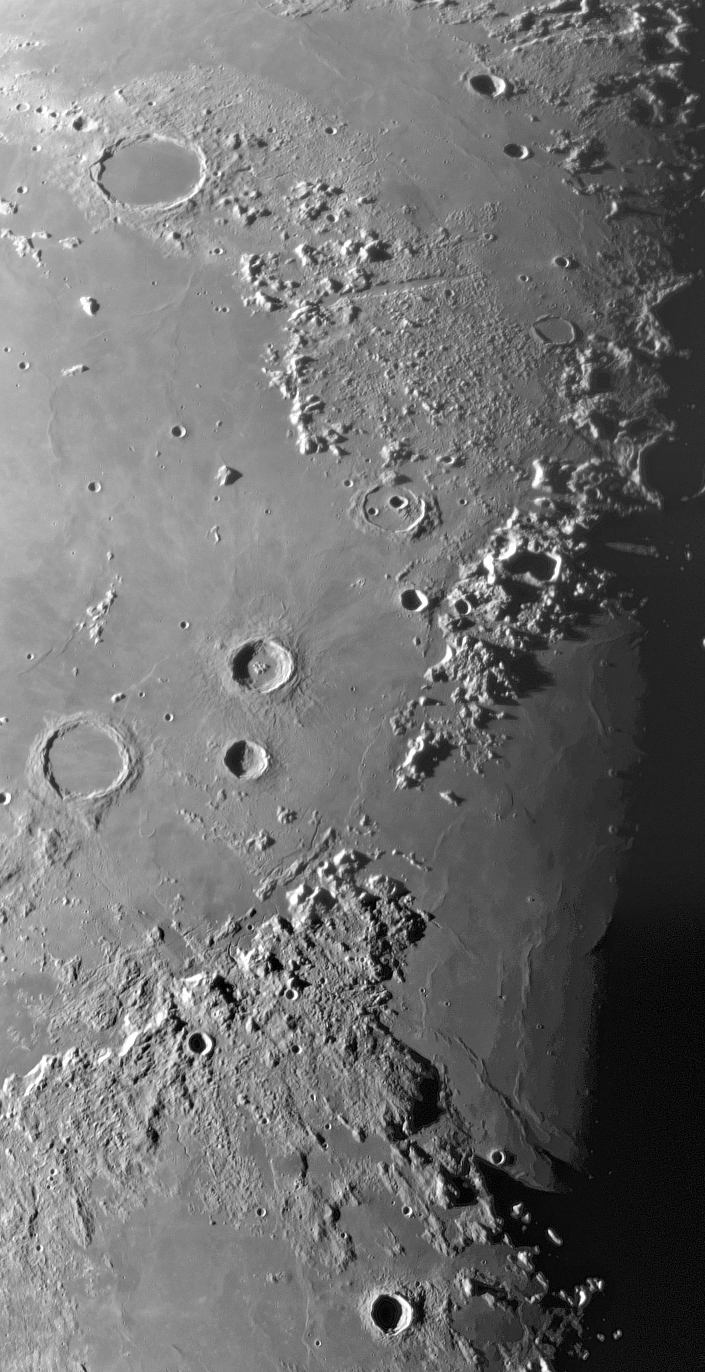 Abnehmender Mond einen Tag vor letztem Viertel. Die wärmste Nacht des Jahres sorgte für einen geringen Temperaturunterschied zwischen Tag und Nacht und daher für sehr gutes Seeing. Panorama von drei Bildern. Der Blick schwenkt von Plato über das Alpental bis Manilius.
