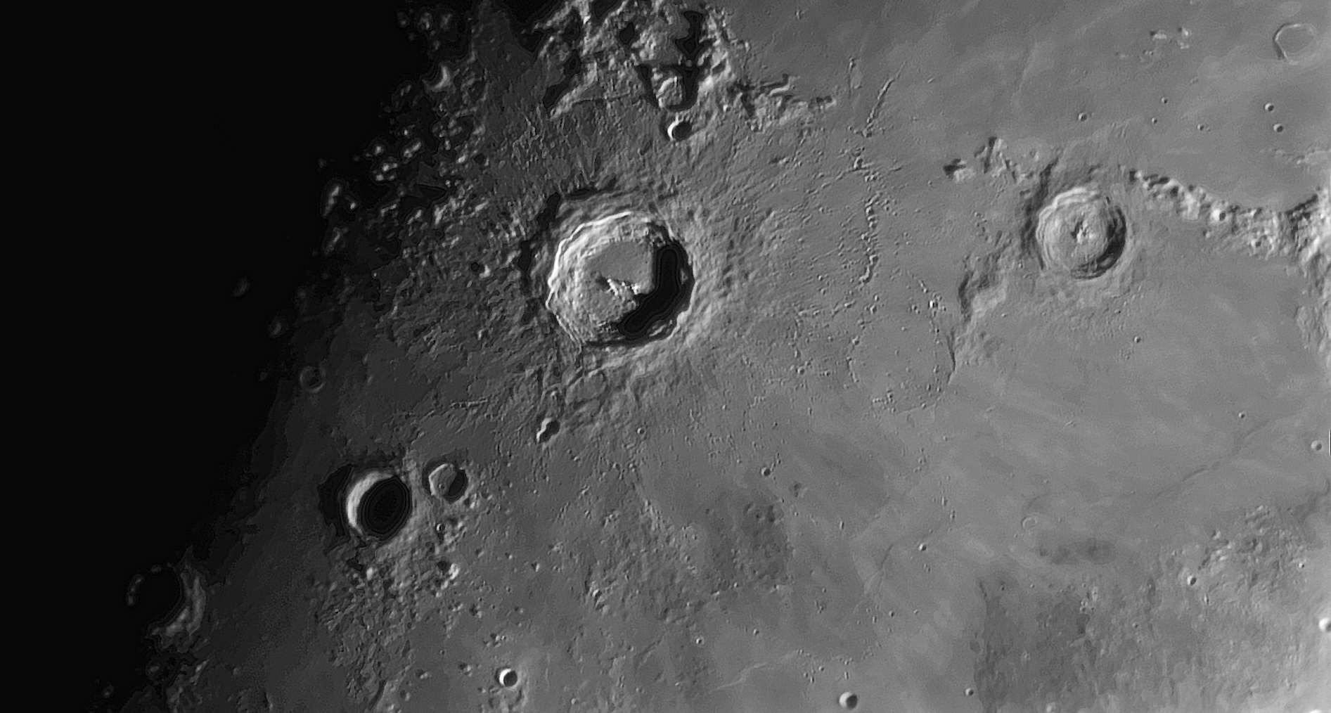 Kratergruppe mit Reinhold, Kopernikus und Eratosthenes. Auffällig südlich von Kopernikus das dunkle Feld pyroklastischer Ablagerungen mit vulkanischen Domen, nicht unähnlich den berühmteren Marius Hills am westlichen Mondrand.