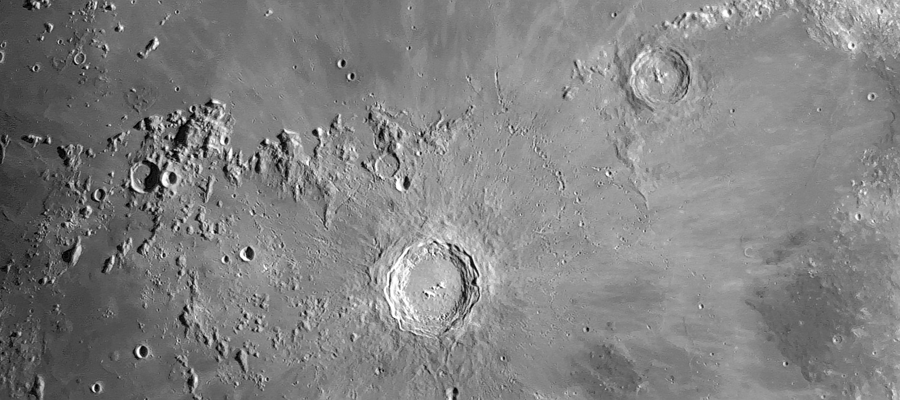 Montes Carpatus mit Krater Tobias Mayer und vielen Milichius-Domen. Diese Dome sind vulkanischen Ursprungs. Panorama aus zwei Bildern.