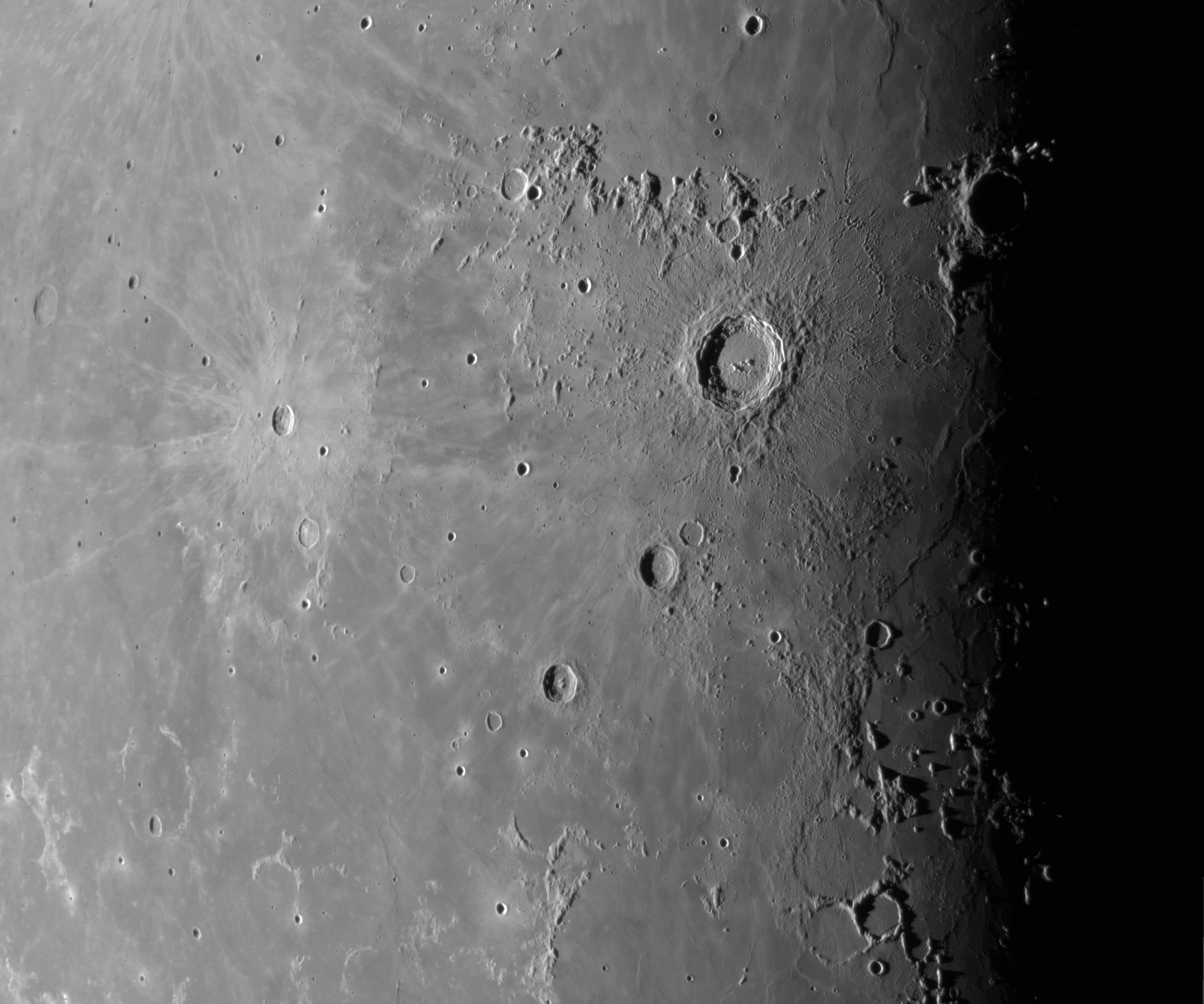 Gegen fünf Uhr heute Morgen war das Seeing ausgezeichnet, was mir erlaubte, ein Sechs-Bild-Panorama der Kopernikus-Region aufzunehmen. Mir ging es dabei vor allem um die vulkanischen Dome in Gambart, Hortensius, Milichius und Reinhold. Besonders die drei Gambart-Dome sind sehr seltene Besucher meiner Skyris-236. Sie liegen meist in der Mondnacht oder im zu hellen Mondtag. Heute lagen sie genau am Terminator.