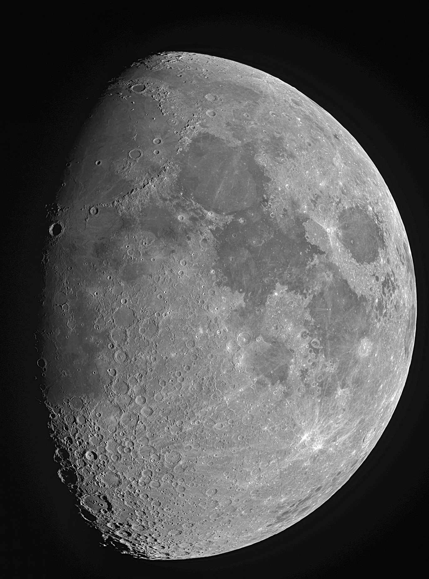Annehmbares Resultat, wenn man bedenkt, daß das Seeing bei einer Mondhöhe von nur -3° und stark fallender Temperatur sehr mäßig war. Ich hatte mir 3 Stunden Zeit für den Mond genommen, mit dem kürzerbrennweitigen CFF 160/1050 mm und konnte während dieser 3 Stunden ein Seeing beobachten, das von ganz gut über ziemlich schlecht zu ziemlich gut und ganz schlecht wieder zu gut wanderte. Ausdauer und Warten konnten sich also lohnen.