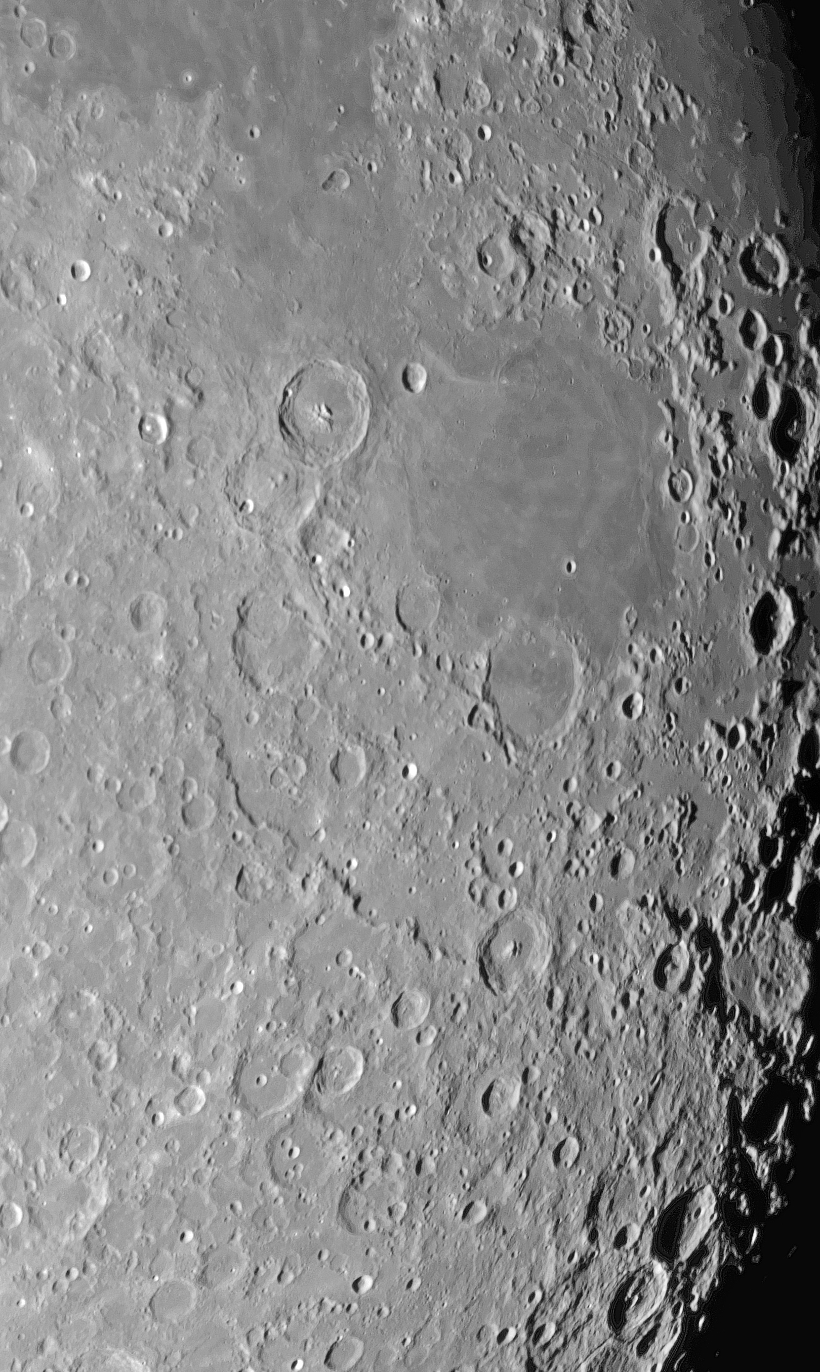 Neben vielen interessanten Details zeigt dieses Mosaik von drei Bildern sehr schön, dass das Mare Nectaris ein Einschlagsbecken ist, von mehreren Ringen umgeben. Frappant ist Rupes Altai, ein Abschnitt eines dieser Ringe.
