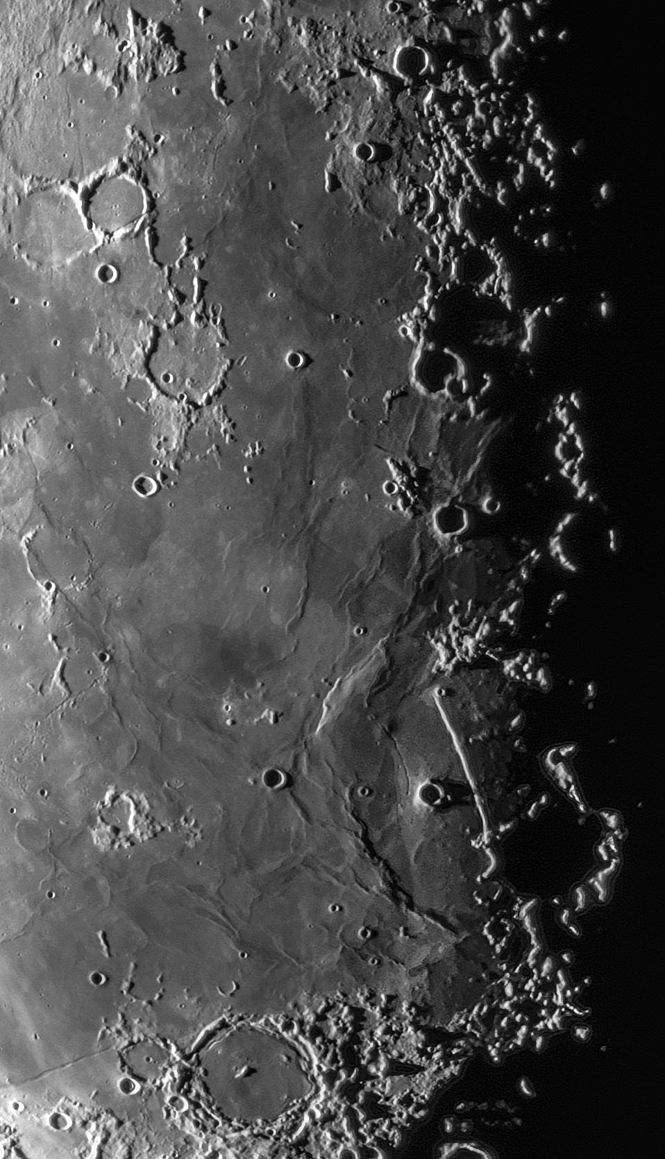 So nahe am Terminator gleicht der Mondboden zerknülltem Papier. Am interessantesten ist die Rima Birt. Bei dieser extremen Beleuchtung taucht der vulkanische Dom auf, der von der Rille zweigeteilt ist.