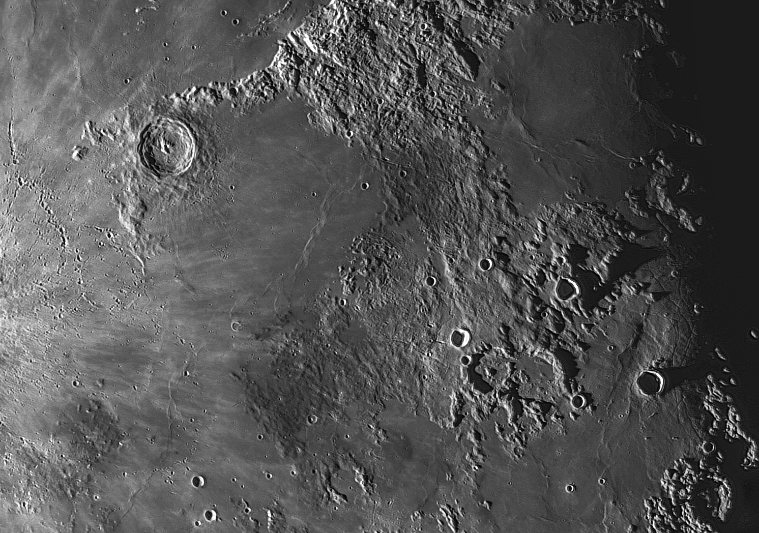 Unterhalb von Eratosthenes liegen die gewaltigen pyroklastischen Depots von Kopernikus und Sinus Aestum, erkennbar an ihrer schwarzen Farbe.
