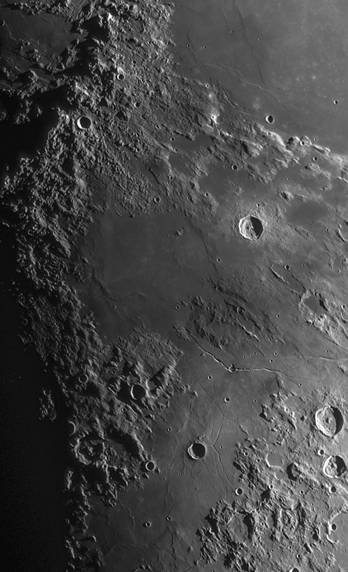 Am 24. März 2018 stand der Mond im Ersten Viertel, ideal für das Gebiet mit Apenninen und Rillen wie Hyginus und Triesnecker.