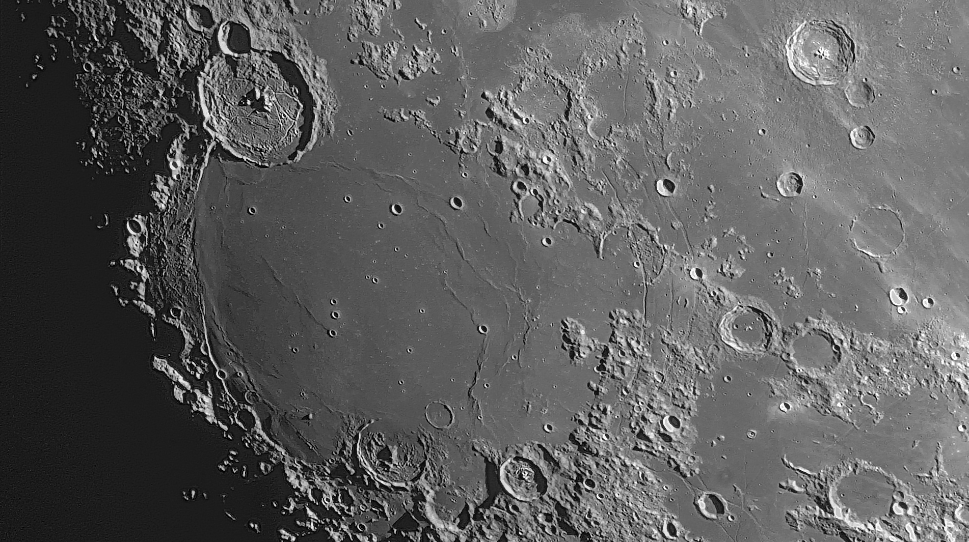Krater Gassendi im Mare Humorum (Meer der Feuchtigkeit) oder etwas burschikoser ausgedrückt: Oma Gassendi (mit Chignon) in ihrer Badewanne. Leider etwas weiter entfernt vom Terminator und deshalb nicht so plastisch: Die vulkanischen Dome Kies pi westlich von Krater Kies und Capuanus 1 (im gleichnamigen Krater).