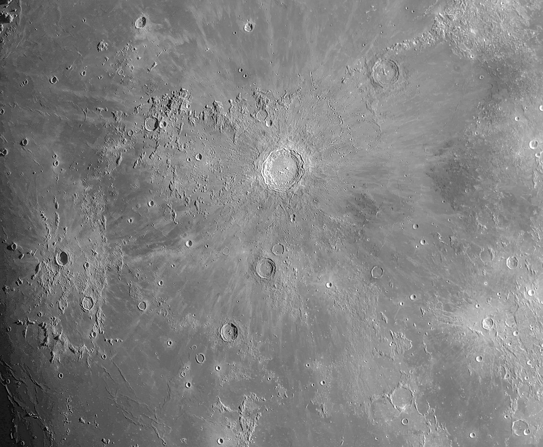 Panorama aus sechs Bildern mit Kopernikus. Zu sehen sind unter anderem die vulkanischen Dome in Milichius, Hortensius, Reinhold und Kepler.
