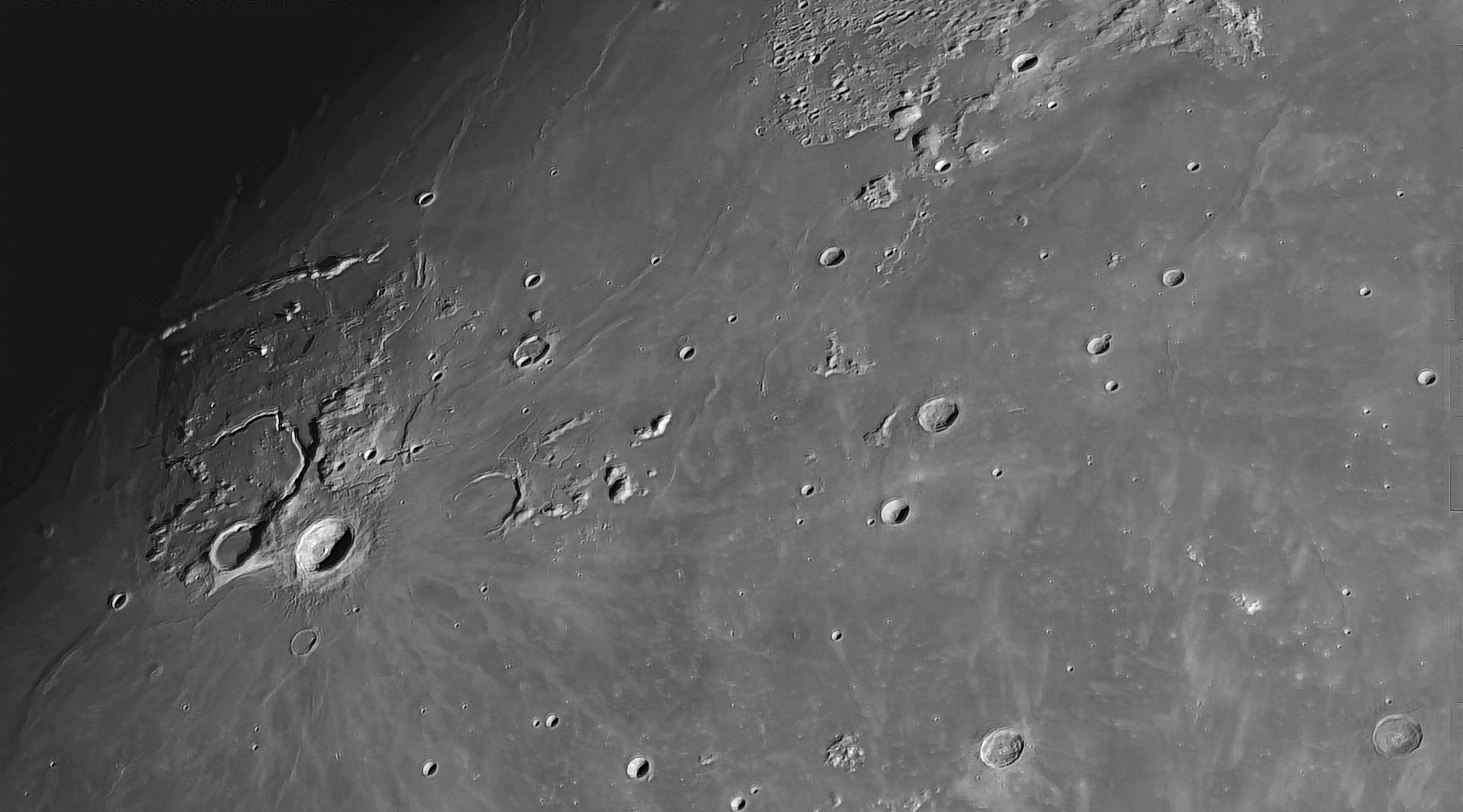 Die ganze Nordostseite des Mondes ist eminent vulkanisch. Zuerst seien die Gruithuisen-Dome genannt (oben Mitte rechts). Sie sind die höchsten Mondvulkane mit 1800 und 2000 Meter Höhe. Dann folgt das bekannte Schrötertal, das nur Teil eines rautenförmigen Vulkanschilds ist. Prominent die Krater Aristarch (hellster Mondkrater) und Herodotus, als südlicher Abschluß des Schildes. Südlich von Herodotus findet sich noch der Vulkandom Herodotus Omega mit 3,5 Kilometer langem Gipfelkrater.