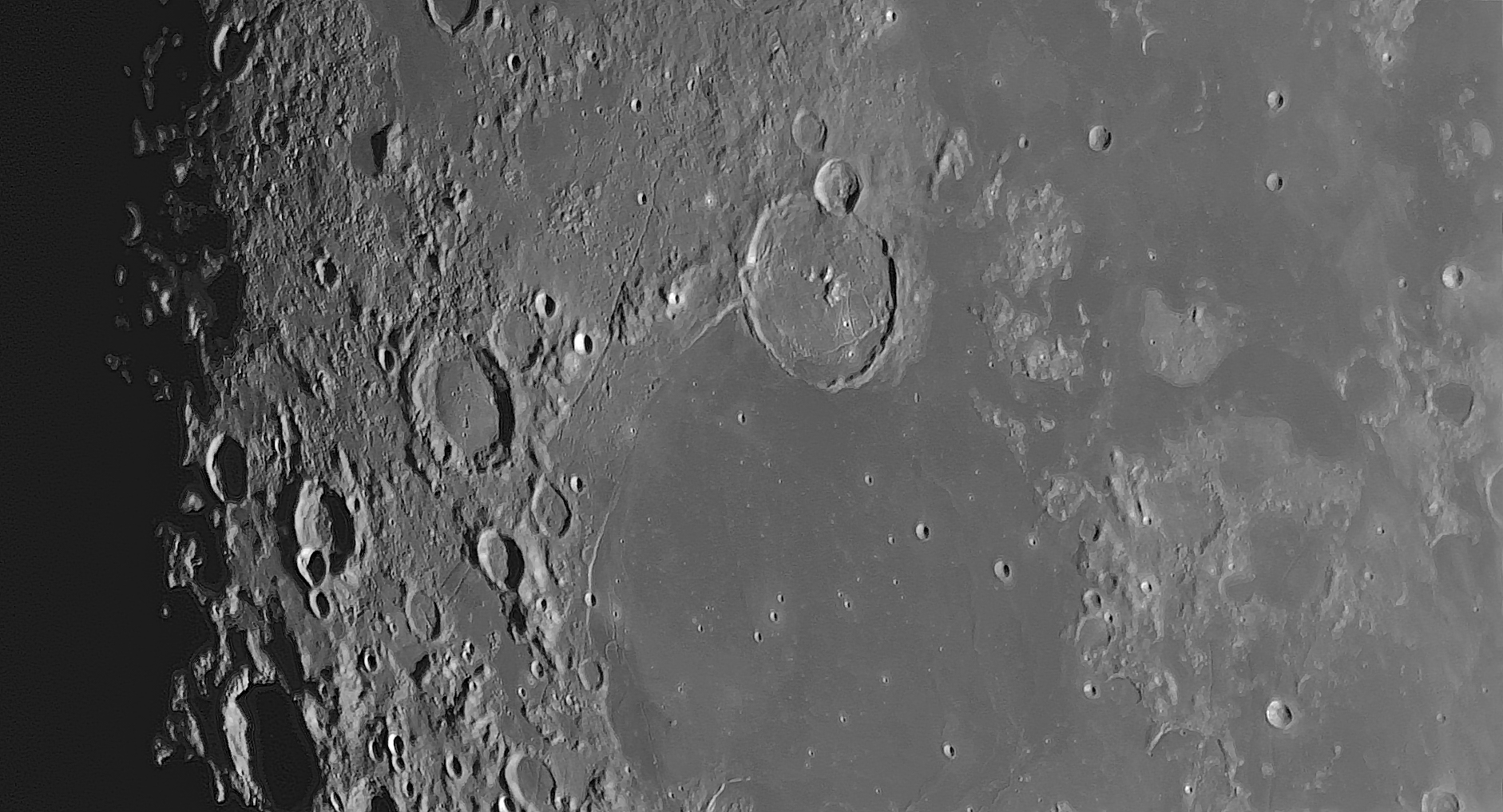 Der auffällige Krater Gassendi (110 km) schließt das Mare Humorum (Meer der Feuchtigkeit, nicht des Humors) im Norden ab. Auffällig die Mersenius-Rille und Rupes Liebig, eine Bruchkante am Westrand des Mare.