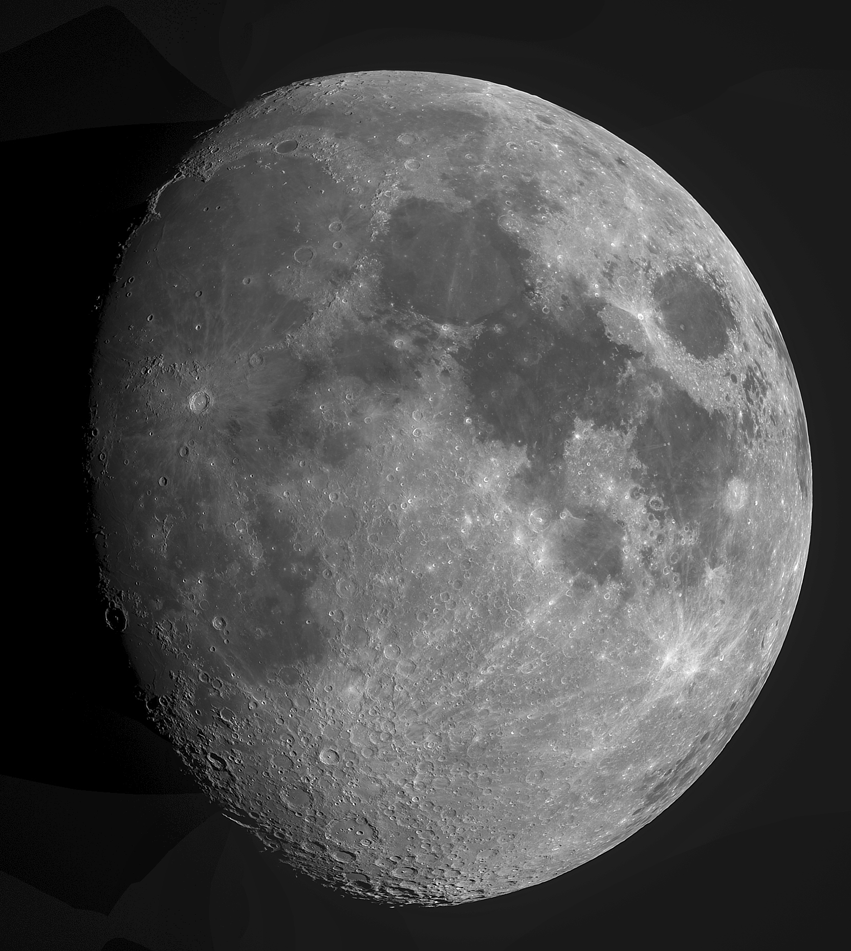 Drei Tage nach dem Ersten Viertel hat der Mond die meisten seiner Oberflächendetails aufgedeckt. Fehlt nur noch die Vulkanprovinz am linken Mondrand, mit Schröter-Tal, Aristarch und Marius Hills. Gassendi schält sich langsam aus dem Dunkel.