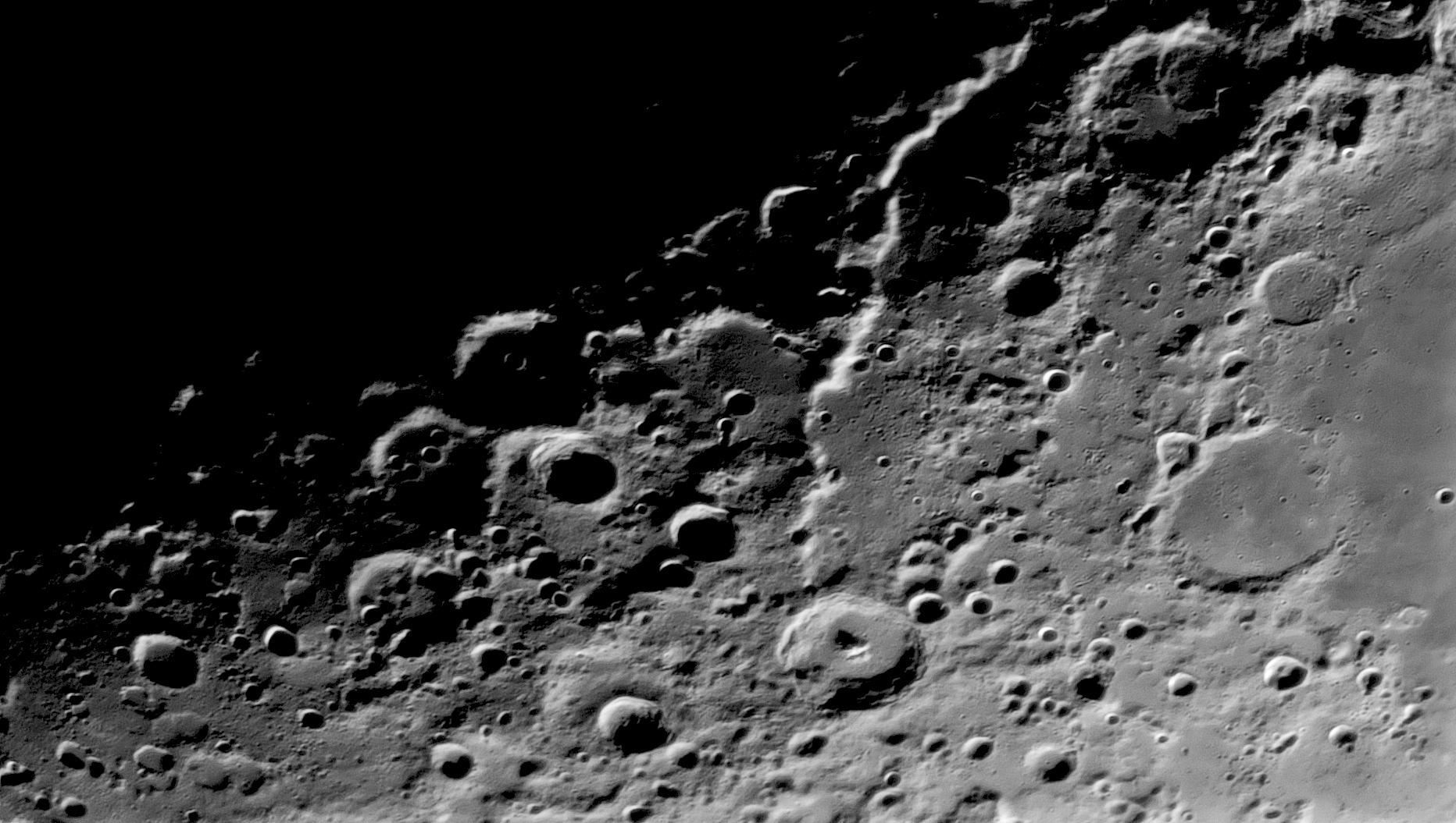 Rupes Altai erstreckt sich vom Krater Catharina 430 km bis zum Krater Piccolomini. Die gigantische Furche ist Überbleibsel eines Rings um das Mare Nectaris und erreicht bis 4000 m Höhe.