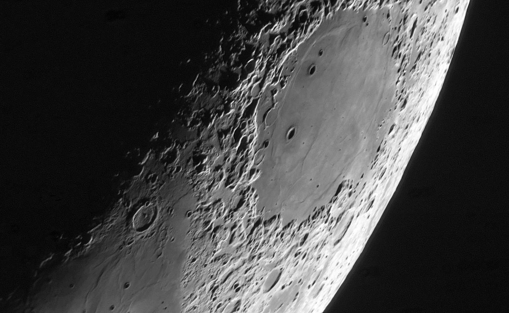 Am westlichen Rand des Mare Crisium ist der Krater Yerkes zu sehen. Dank sehr günstiger Terminatorstellung ist der vulkanische Dom Yerkes 1 deutlich zu erkennen. Klein, aber deutlich sichtbar die drei Dome Yerkes A, B und C. Die hatte ich bisher noch nie gesehen.