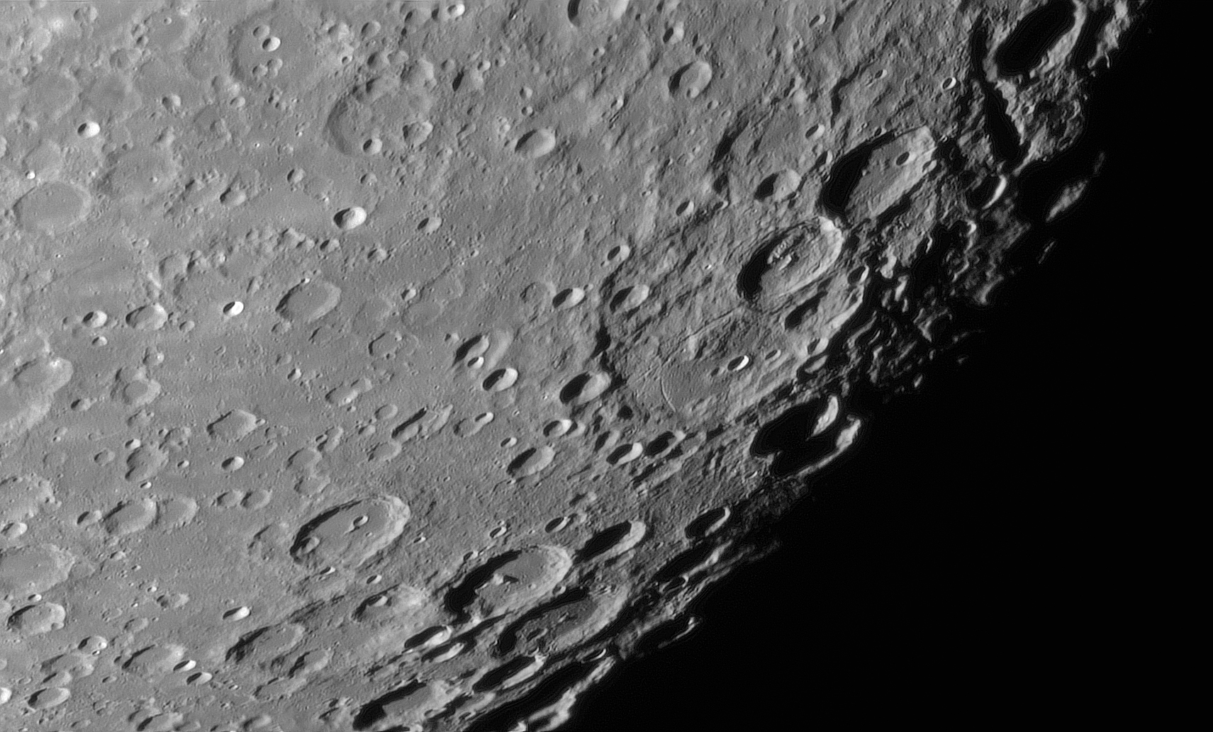 Sehr gut bekannt die gebogenen Rimae Janssen. Krater Fabricius mit Rutschungen am Kraterwall.
