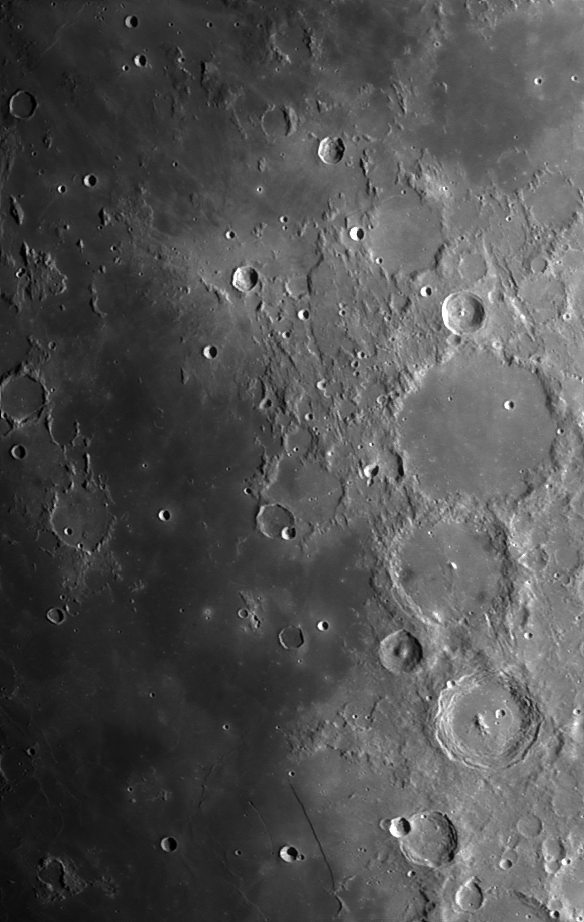 Gegen 20:10 Uhr klarte über Linger der Himmel auf. Die Chance auf ein halbstündiges Wolkenloch erahnt, Material herbeigetragen und losgelegt. Nach dem ersten Bild kamen leider schon die ersten Wokenfetzen an. Es gelangen trotzdem 2 AVIs mit der Hand am Verstärkungsregler. Bild zu hell = Gain runter, Bild zu dunkel = Gain rauf. Pro AVI geschätzte 50-mal. Trotzdem alles drauf: Dreigestirn des Mondzentrums mit Langer Wand, Rima Birt und Catena Davy.