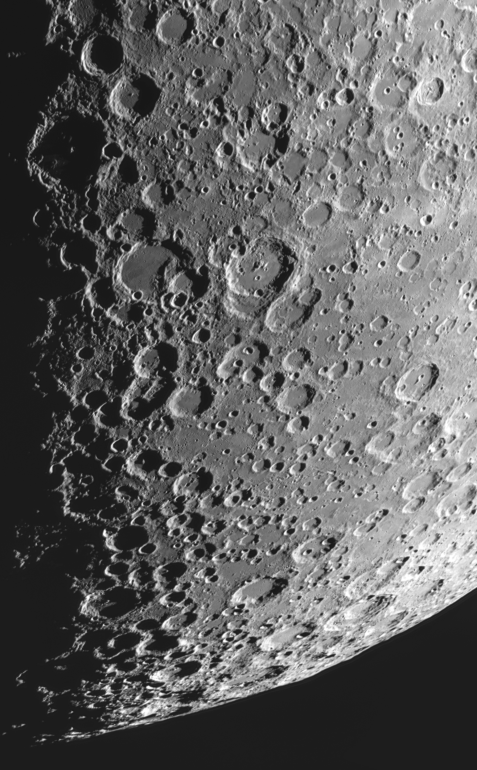 Der Blick geht von Purbach (oben links) bis zu Malapart und Scott (5 bis 6 Grad vom Mondsüdpol entfernt). Mosaik aus drei Bildern.
