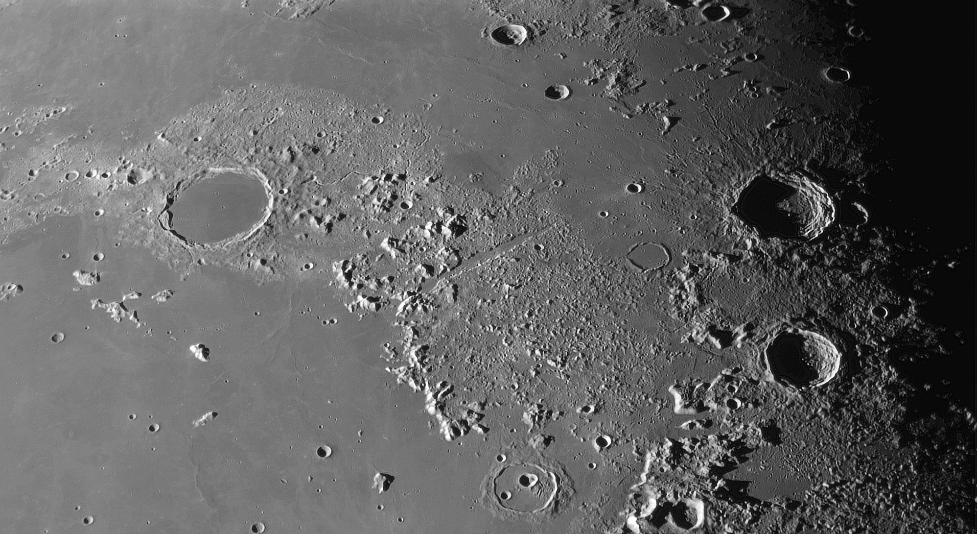 Plato und Alpental und eine der schönsten Mondlandschaften. Durch den Schatten von rechts mysteriös aus der einbrechenden Mondnacht von Aristoteles und Eudoxus gegrüßt. Die aristotelischen Auswurfmassen zielen auf Protagoras und Archytas.