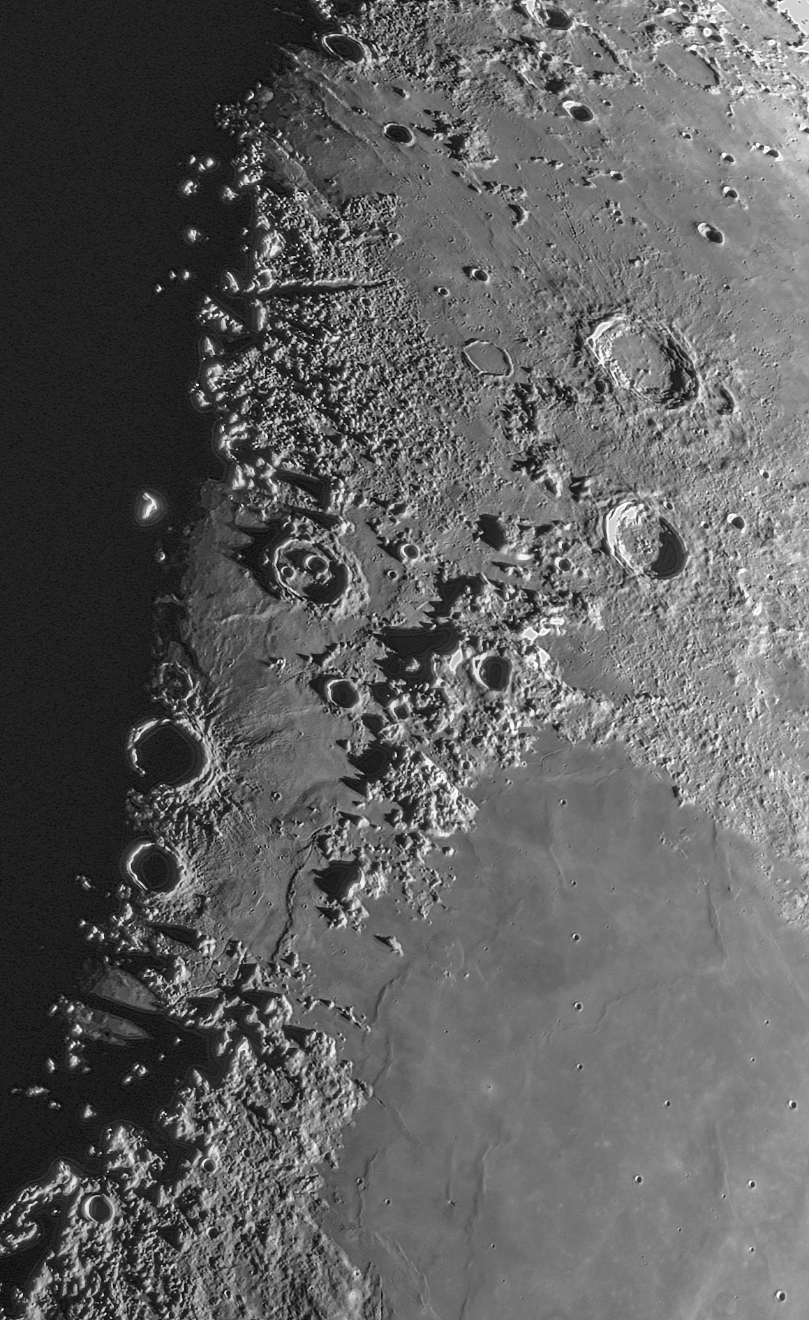 Das Alpental schält sich langsam aus der Mondnacht, die Berge des Kaukasus und der Apenninen werfen lange Schatten und die vulkanischen Dome Valentine, Aristillus und Autolycus sind durch die streifende Beleuchtung sehr gut zu erkennen.