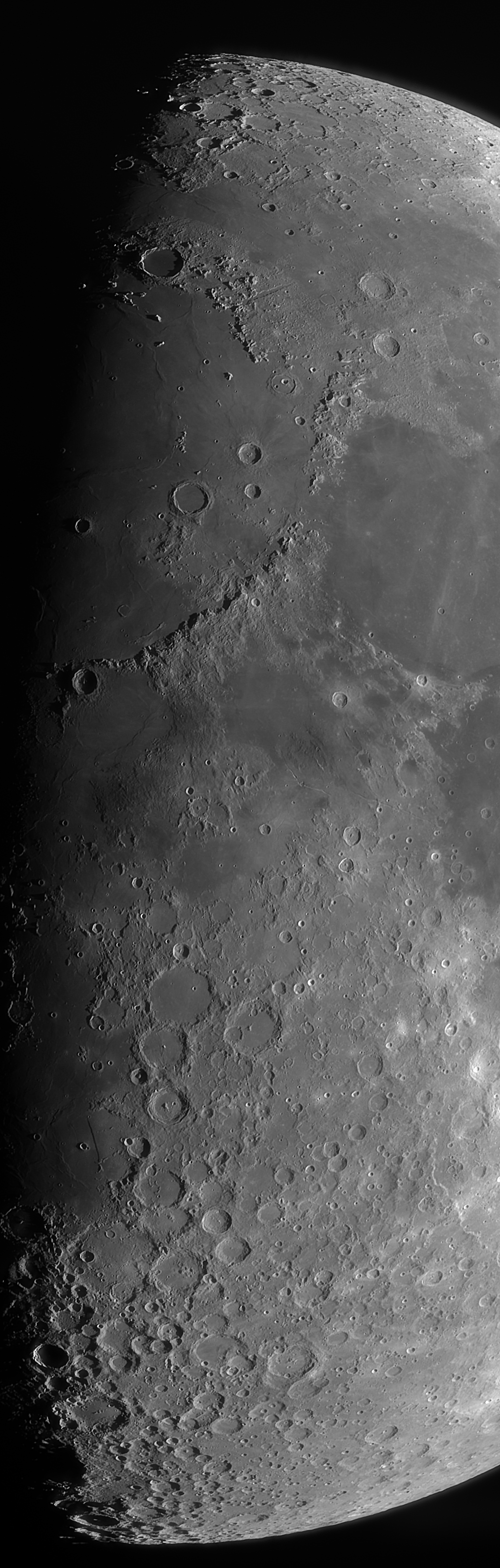 Der Mond im Ersten Viertel ist die meistfotografierte Mondphase. Der Mond steht am frühen Abend schön hoch am Himmel. Der gerade Terminator zeigt eine Menge der schönsten Mondformationen wie das Dreigestirn Ptolemäus, Alphonsus und Arzachel, das Alpental neben Krater Plato, viele Rillen wie die Hadley-Rille, die Gerade Wand usw.