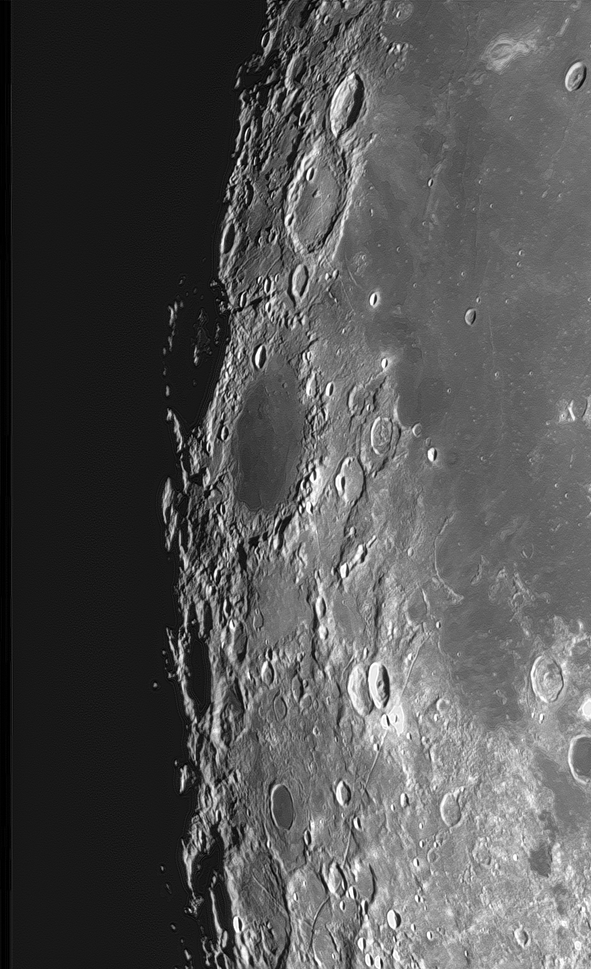 Die Sirsalis-Rille ist in ihrer ganzen Ausdehnung zu sehen. Nördlich die Krater Grimaldi, Hevelius und Cavalerius. In Grimaldi gibt es einen grossen vulkanischen Dom, Hevelius könnte mit seinen gekreuzten Rillen als Reklame für Meißner-Porzellan herhalten. Cavalerius zeigt deutlich seine Schiffchen-Form.