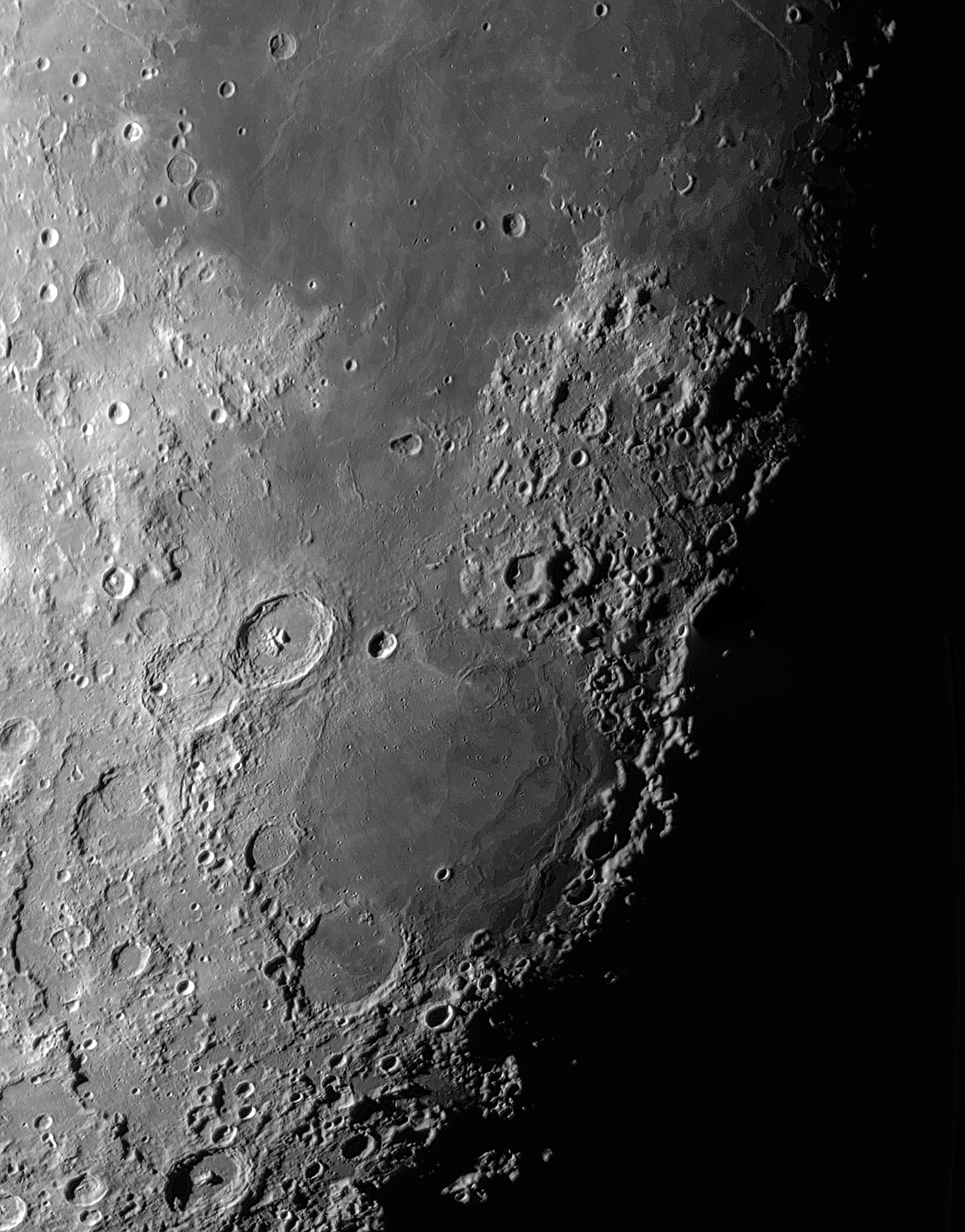 Mondpanorama aus zwei Bildern. Es reicht von Cauchy bis Piccolomini und zeigt unter anderem die vulkanischen Dome in Cauchy, Fracastorius und Piccolomini.