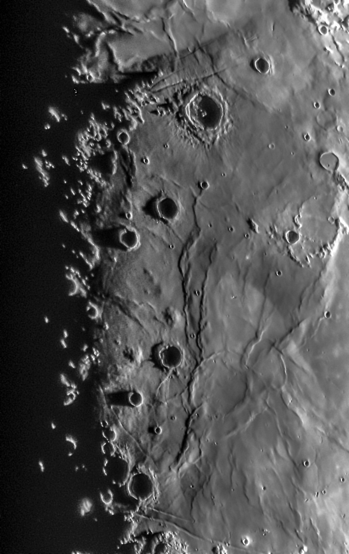Der Krater Arago mit seinen elf bisher bekannten vulkanischen Domen. In der unteren Bildhälfte der Landeplatz von Apollo 11 mit den Kratern Armstrong-Collins-Aldrin. Wie ein Aderngeflecht zeichnen sich die vielen Dorsae bei dieser extrem flachen Beleuchtung ab und umrahmen den Geisterkrater Lamont.