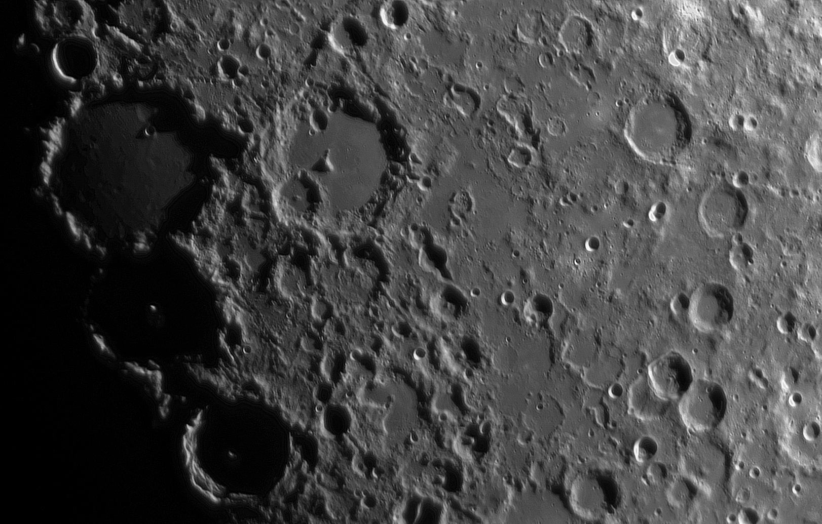 Für das Monddreigestirn Ptolemäus, Alphonsus und Arzachel beginnt der Mondtag. Gut zu sehen sind zwei Kraterketten: Catena Abulfeda (51 Kilometer), die aus 25 Kratern besteht und eine viel kürzere rechts neben Ptolemäus.