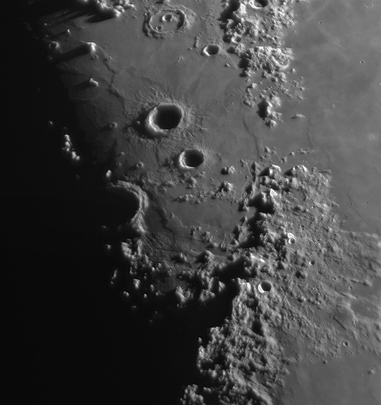 Wer mit seinem Raumschiff die Gebirge Montes Apenninus und Montes Caucasus von Ost nach West überfliegt, hat einen wunderbaren Ausblick auf den Sumpf der Fäulnis (Palus Putredinis). Er birgt so manche Schätze wie die AAA-Kratergruppe Archimedes, Aristillus und Autolycus. Nicht zu vergessen die schön geschwungene Hadley-Rille, die sich eben aus der Mondnacht schält, Heimat einige Tage im Juli 1971 für die Landecrew von Apollo 15.