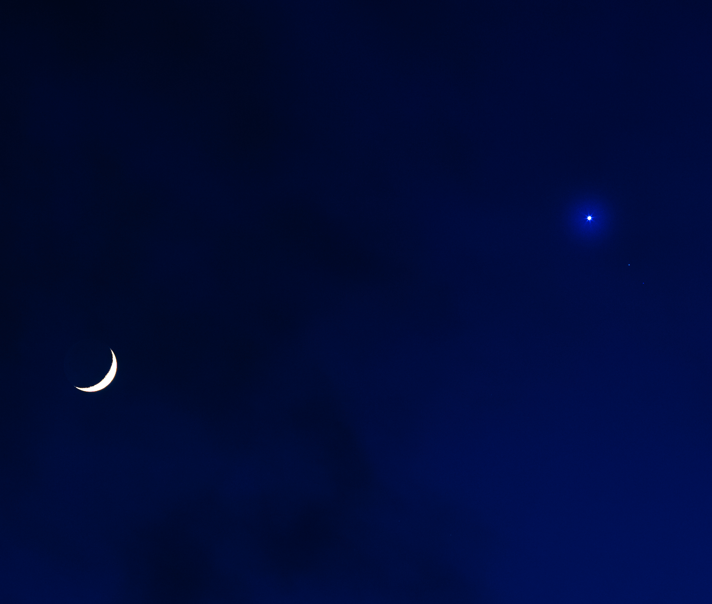 Wer am 28. Januar nach Sonnenuntergang nach Westen schaute, der entdeckte die schmale Mondsichel neben der Venus. Hatte man ein Fernglas zur Hand, erkannte man direkt unterhalb der Venus auch noch den Planeten Neptun, der als recht schwaches Sternchen leuchtete. Auf diesem Bild erkennt man rechts unterhalb der Venus den Stern Phi Aquarii, nochmals rechts unterhalb des Sterns einen weiteren Punkt. Ob es sich hierbei wirklich um Neptun handelt, bin ich mir nicht sicher. Die Aufnahme entstand mit einem 135-mm-Teleobjektiv durch eine Wolkenlücke hindurch.