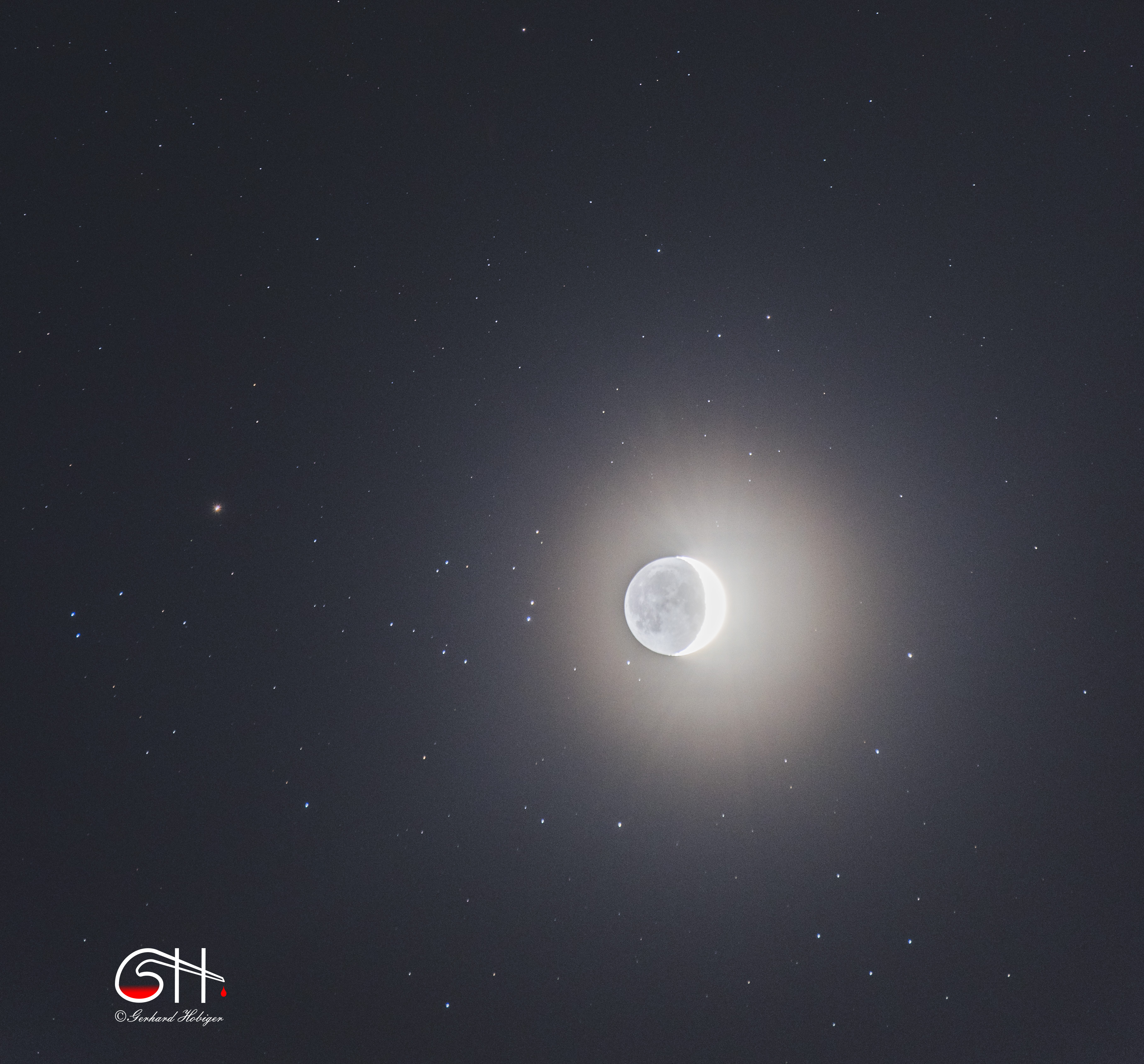 Der junge zunehmende Mond stand am 10. April 2016 in den Hyaden, wodurch auch bei längerer Belichtung das aschgraue Licht und die Hyadensterne sichtbar werden.