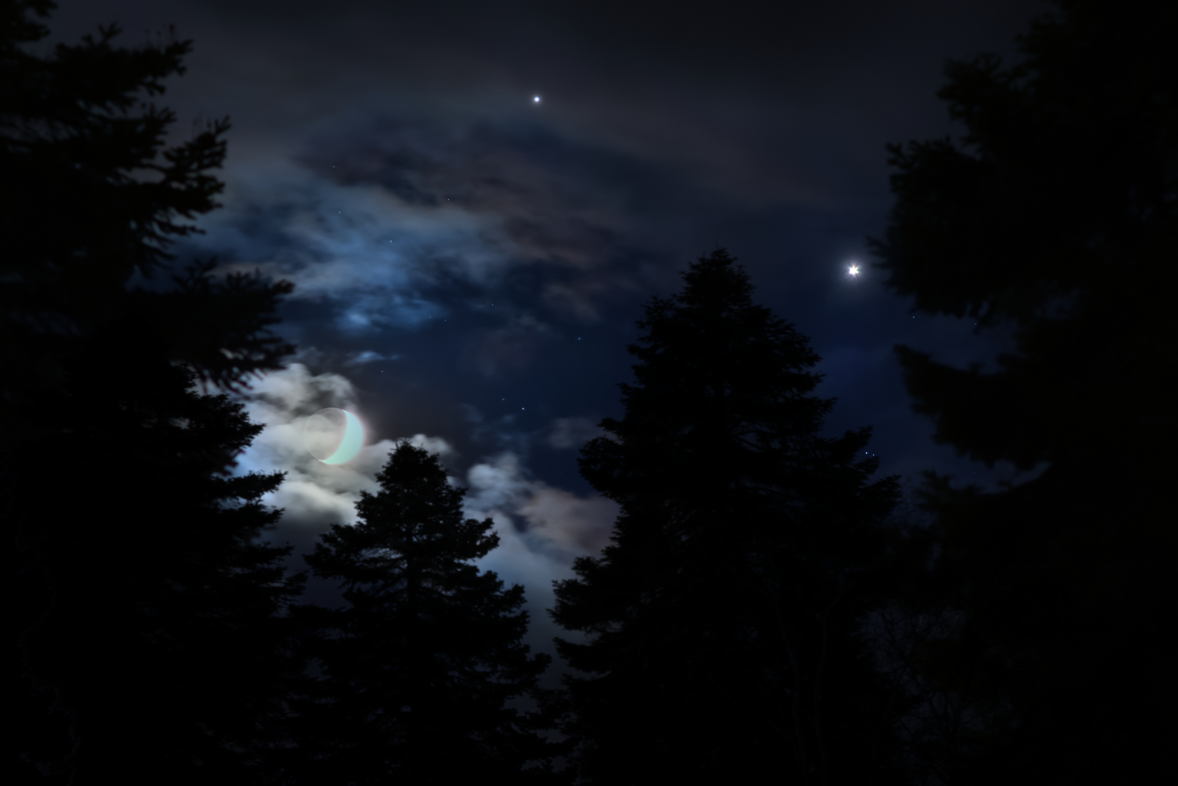 Um diese hübsche Begegnung vom 19. November 2020 zwischen unserem Trabanten und den beiden Gasriesen festzuhalten, blieben nur wenige Sekunden. So kurz blinzelte das himmlische Trio gemeinsam durch eine ansonsten kompakte Wolkendecke. Wer die beiden Gasplaneten in den kommenden Wochen aufmerksam beobachtet, der wird feststellen, dass sie immer enger zusammenrücken. Am 21. Dezember haben die Beiden dann ihre engste Annäherung und erscheinen mit dem bloßen Auge fast als ein Gestirn!