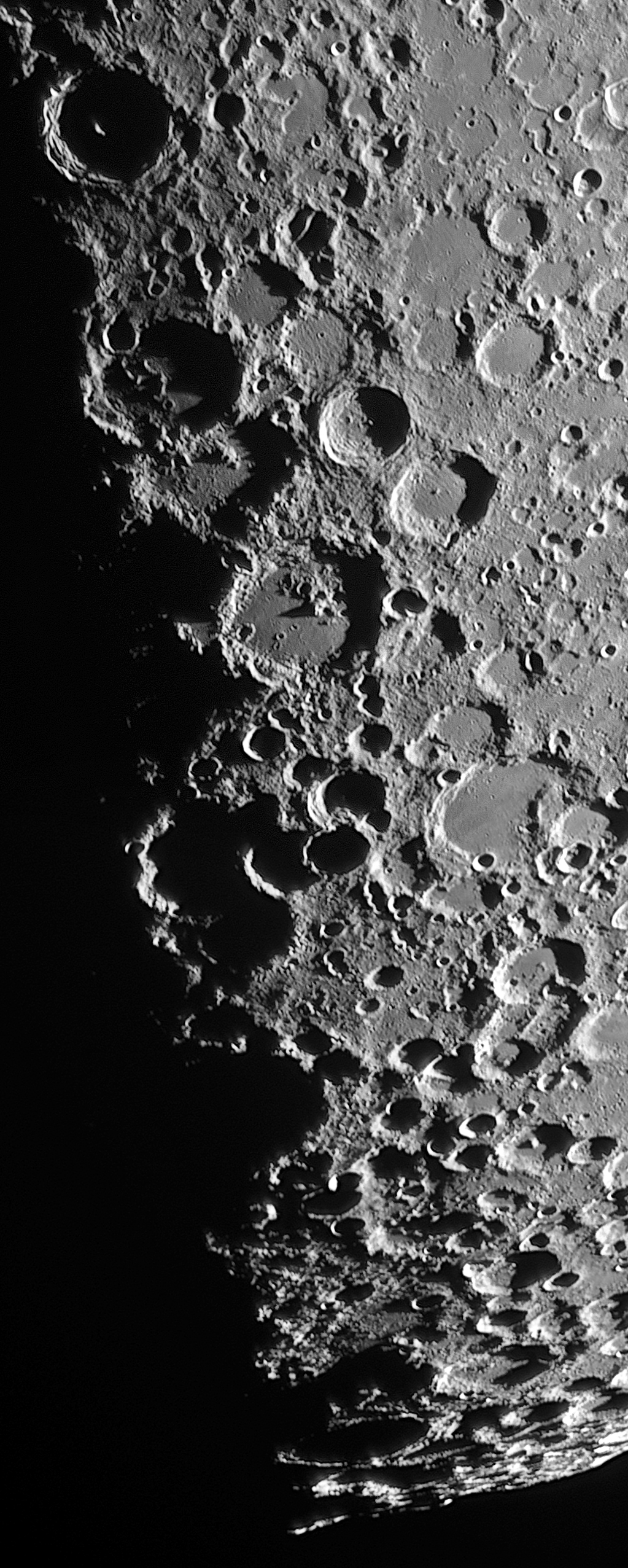 Das südliche Mondpanorama aus zwei Bildern reicht vom Krater Thebit links oben bis zu Malapert. Von da aus ist es nicht mehr weit bis zum Mondsüdpol.