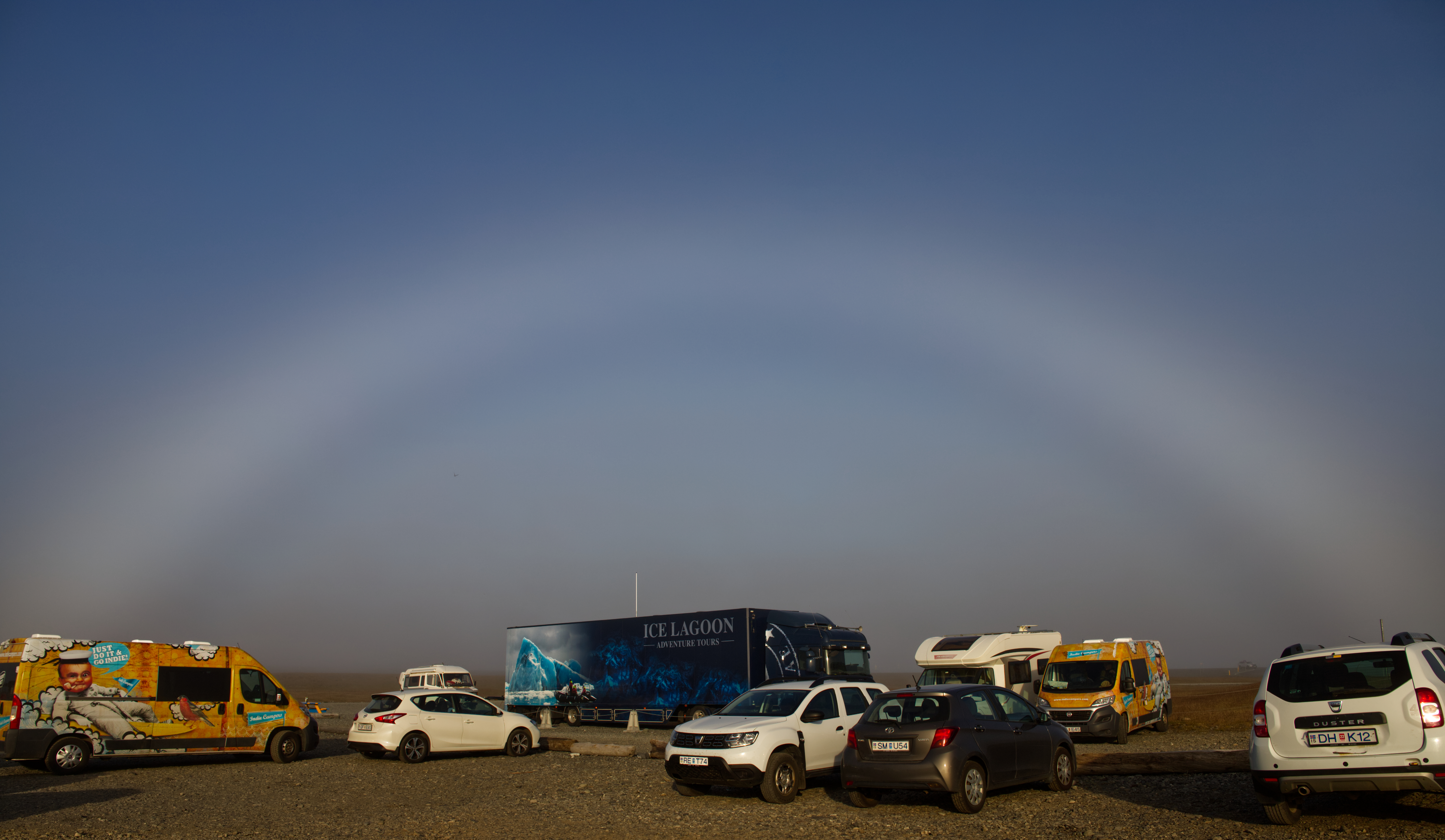 Diese Aufnahme entstand, als ich den Parkplatz der Gletscherlagune verlassen wollte. Es war es Wert, noch mal die Fotoausrüstung aufzubauen, zu fotografieren und den Anblick zu genießen. Der Nebelbogen wird auch als weißer Regenbogen genannt.