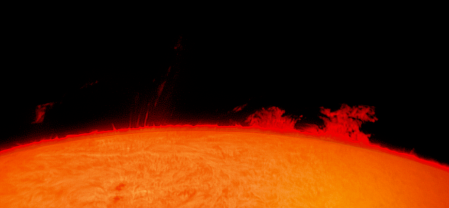 Kaum kommt der "alte 2644" und jetzige "neue" Sonnenfleck 2651 um die Ecke, sorgt er auch schon für schöne Motive. Mein Freund Heinrich Sommerkorn, der die Geschehnisse der Sonne stets im Blick hat, rief mich an und motivierte mich trotz des bescheidenen Wetters, einige Aufnahmen zu machen. Danke dafür. Es war ein wenig schwierig, auf Grund der unterschiedlichen Helligkeitsdynamik, beide Protuberanzengebiete auf ein Bild zu bannen. Getrennt wollte ich sie aber nicht aufnehmen, das hätte den schönen Gesamteindruck doch arg gestört.