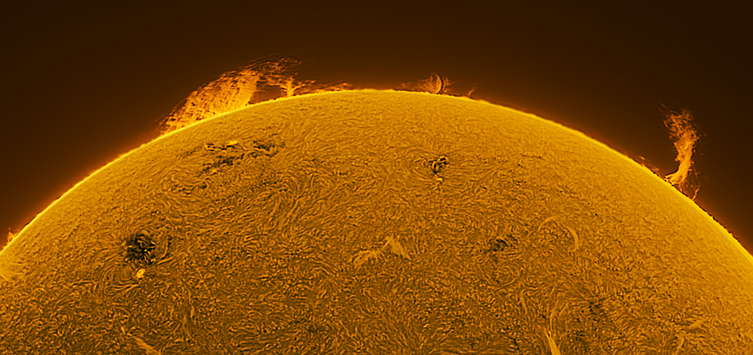 Rand und Scheibe getrennt aufgenommen und in Photoshop zusammengefügt (Die Bildausschnitte stimmen aber natürlich überein). Eine Fortsetzung der Protuberanzen auf der Scheibe als Filamente ist nicht ersichtlich. Ich vermute mal, dass die Protuberanzen den Ursprung in Zonen hatten, welche zu dem Zeitpunkt noch deutlich hinter dem Sonnenhorizont lagen. Leider verhindert seit längerer Zeit übles Wetter eine regelmäßige Beobachtung der Sonne. Dadurch sind die solaren Vorkommnisse weniger gut ersichtlich.