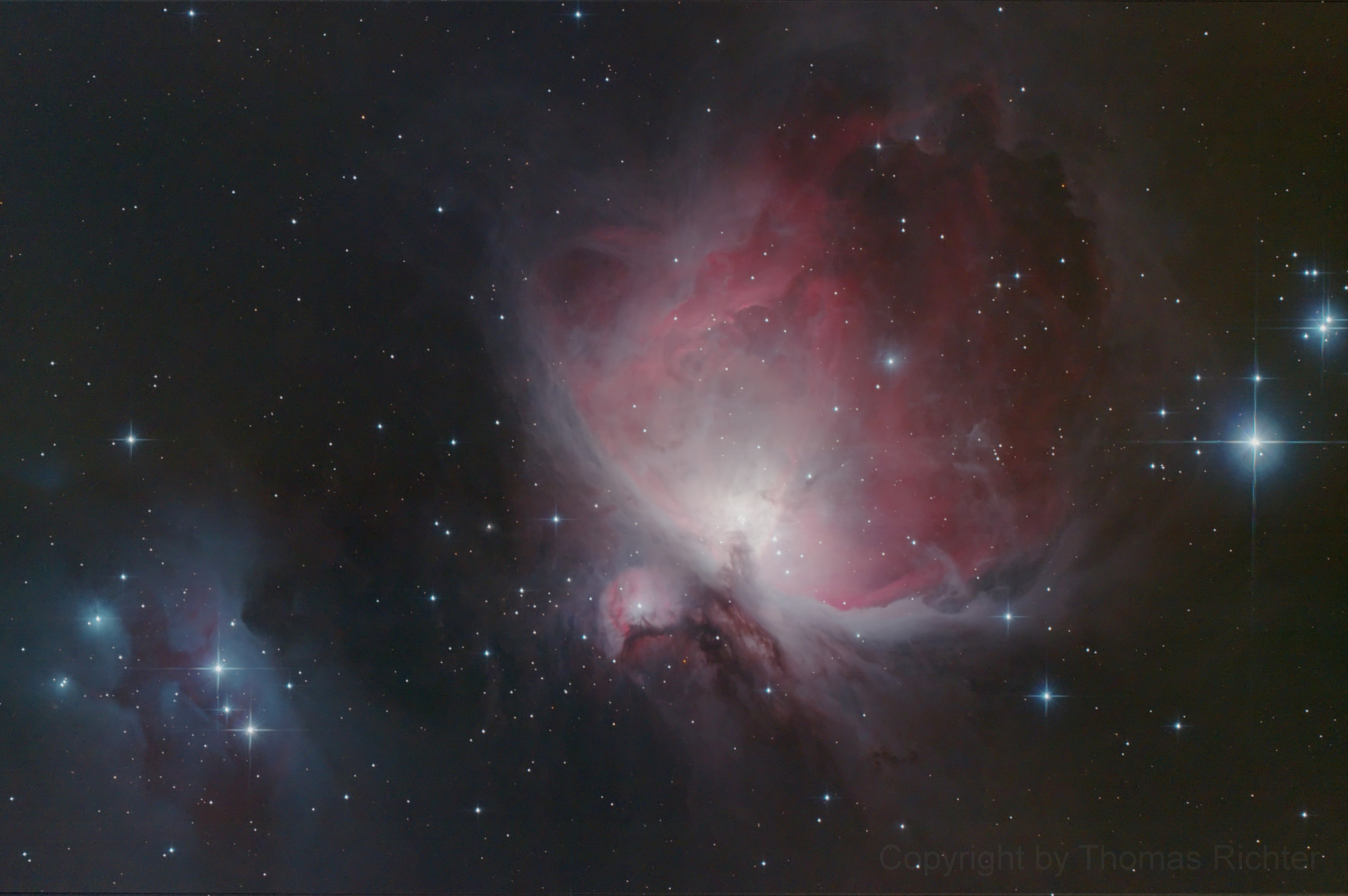 Die Aufnahme entstand aus Einzelbildern mit drei verschiedenen Belichtungszeiten: 100, 30 und 10 Sekunden. Ich hatte versucht den Dynamikumfang von M 42 inklusive der Trapezsterne zu erhalten.