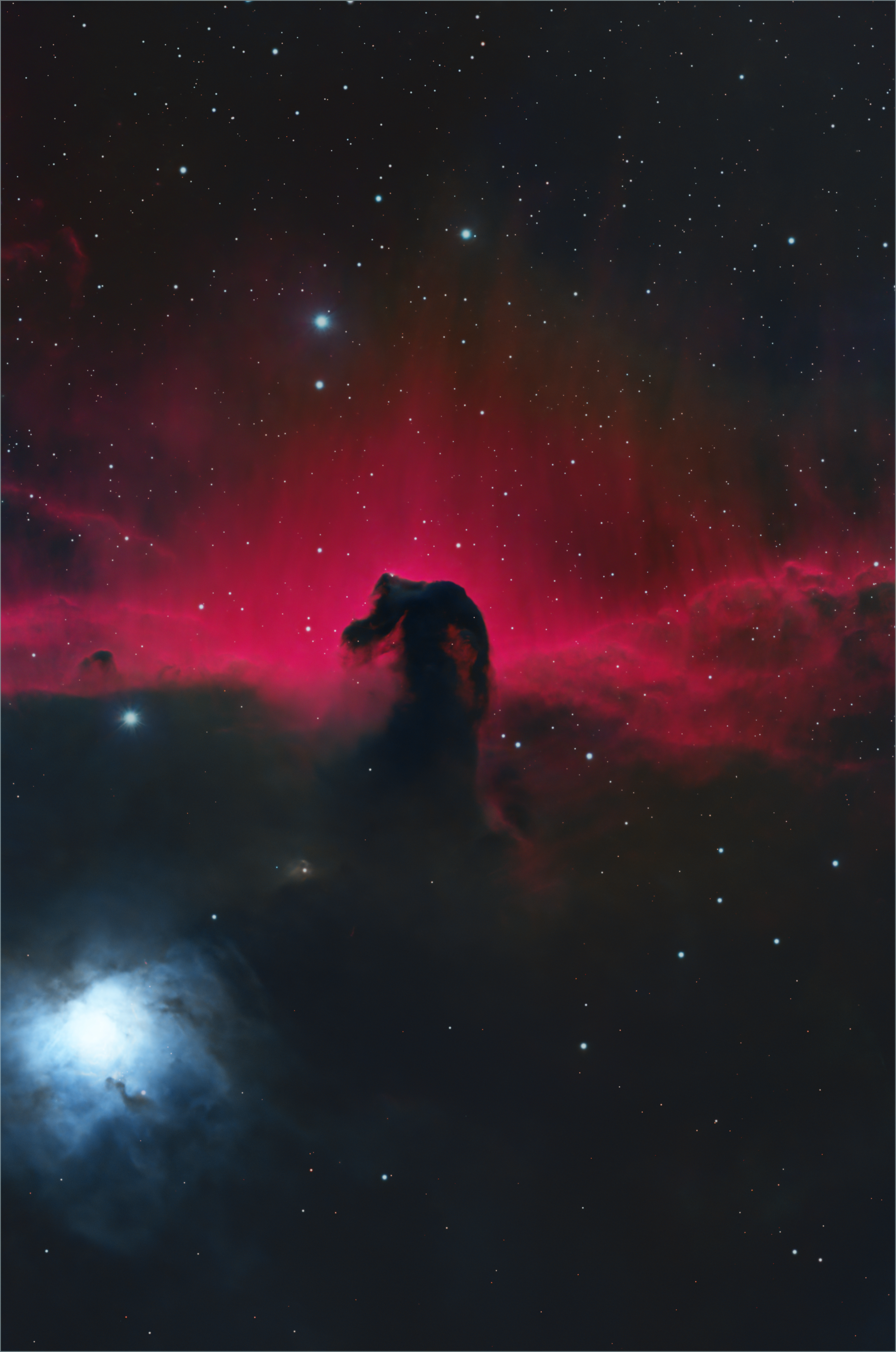 Barnard 33 und IC 434 mit der ASI2600MM am C11 Edge mit Reducer f/7 1960mm Brennweite. 46 x 300 s H-alpha; 40 x 300 s OIII und 42 x 300 s SII...und 30 x 60 s RGB kombiniert als HOS und RGB.
