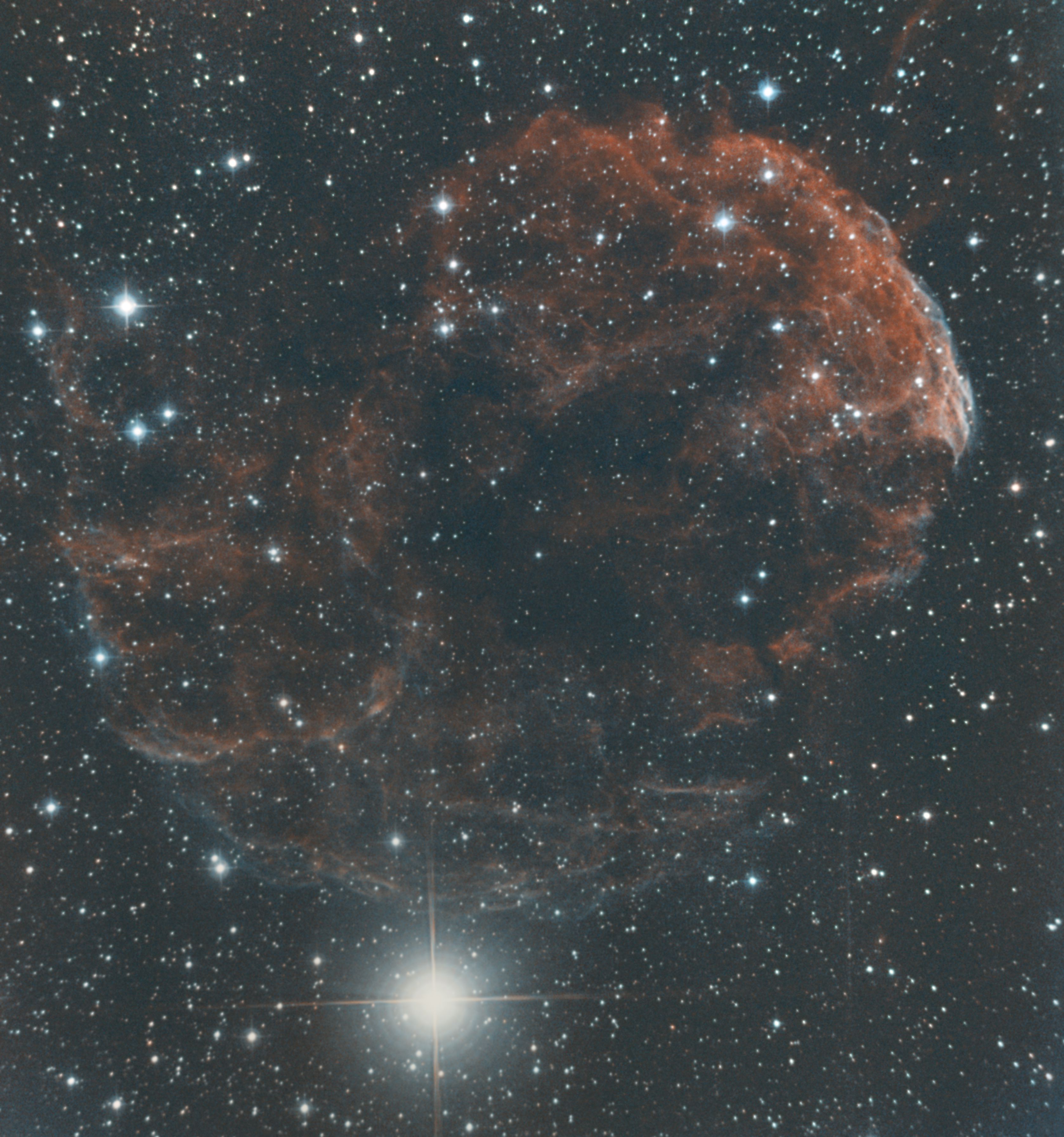 Dieser Quallenähnliche Nebel ist ein Supernovaüberrest im Sternbild Zwillinge. Er ist etwa 5000 Lichtjahre entfernt und hat einen Druchmesser von rund 70 Lichtjahren. Der helle Stern unten im Bild ist Propus, den man schon mit freiem Auge erkennen kann. Dieses Bild ist eines der ersten, die ich mit einer CCD-Kamera und Schmalbandfiltern aufgenommen habe, was mich auch ich in der Nachbearbeitung vor eine gewisse Herausforderung stellte. Das Bild wurde über zwei Nächte mit H-Alpha- und OIII-Filtern aufgenommen.