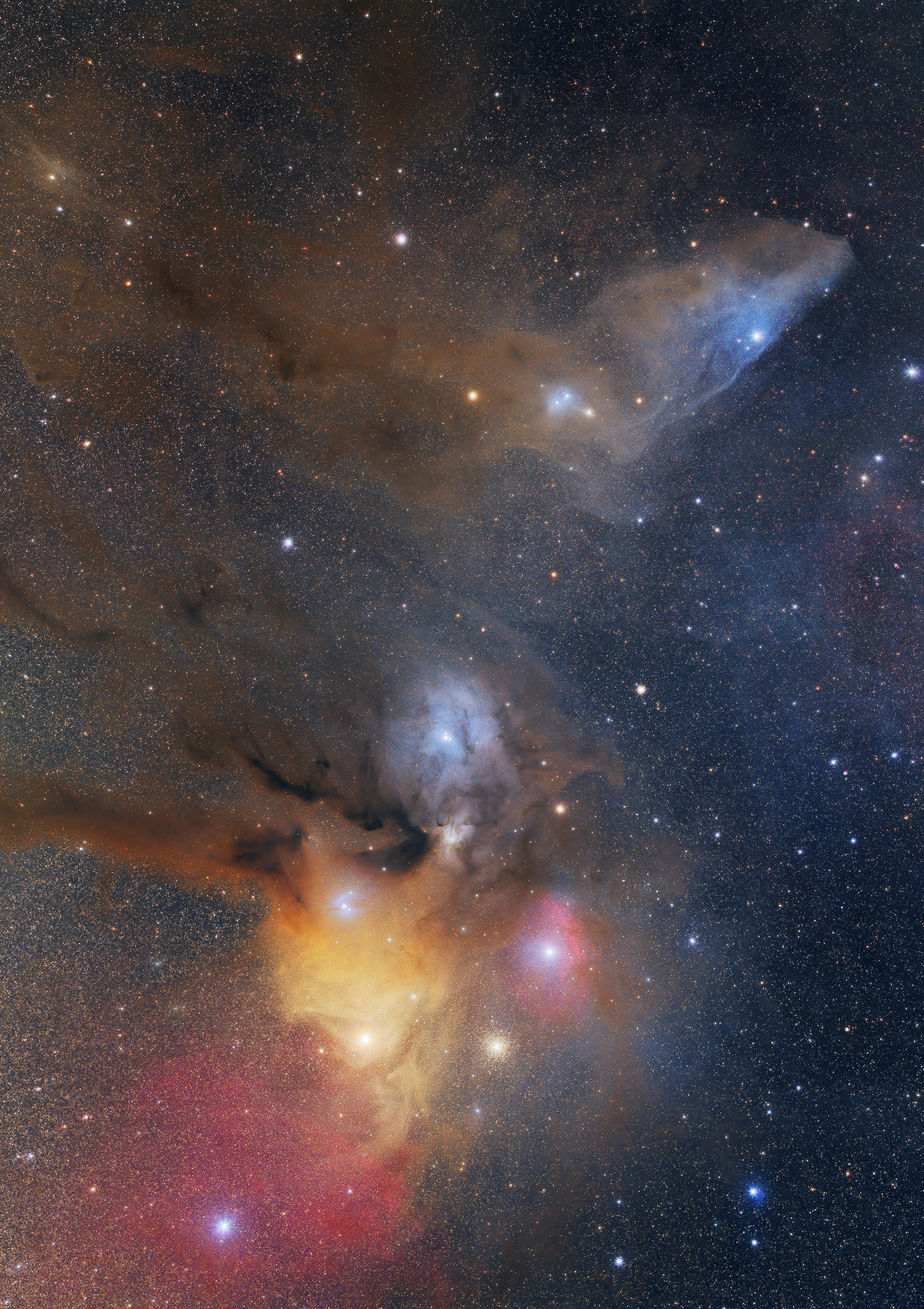 Staub und Gas in allen möglichen Farben und Formen finden wir an der Grenze von Skorpion und Schlangenträger. Der Bereich um Antares reflektiert das Licht des gelben Riesensterns, während umgebende Staub- und Gaswolken, abhängig von der Intensität der in der Nähe befindlichen Sterne, entweder im Licht des ionisierten Wasserstoffs strahlen, das blaue Licht der Sterne reflektieren oder es ganz oder teilweise verschlucken. Der Reflexionsnebel IC 4592 wird auch als blauer oder südlicher Pferdekopf bezeichnet. Das zweiteilige Komposit entstand in der Zeit vom 26. bis 28. Mai 2017. Norden ist oben.
