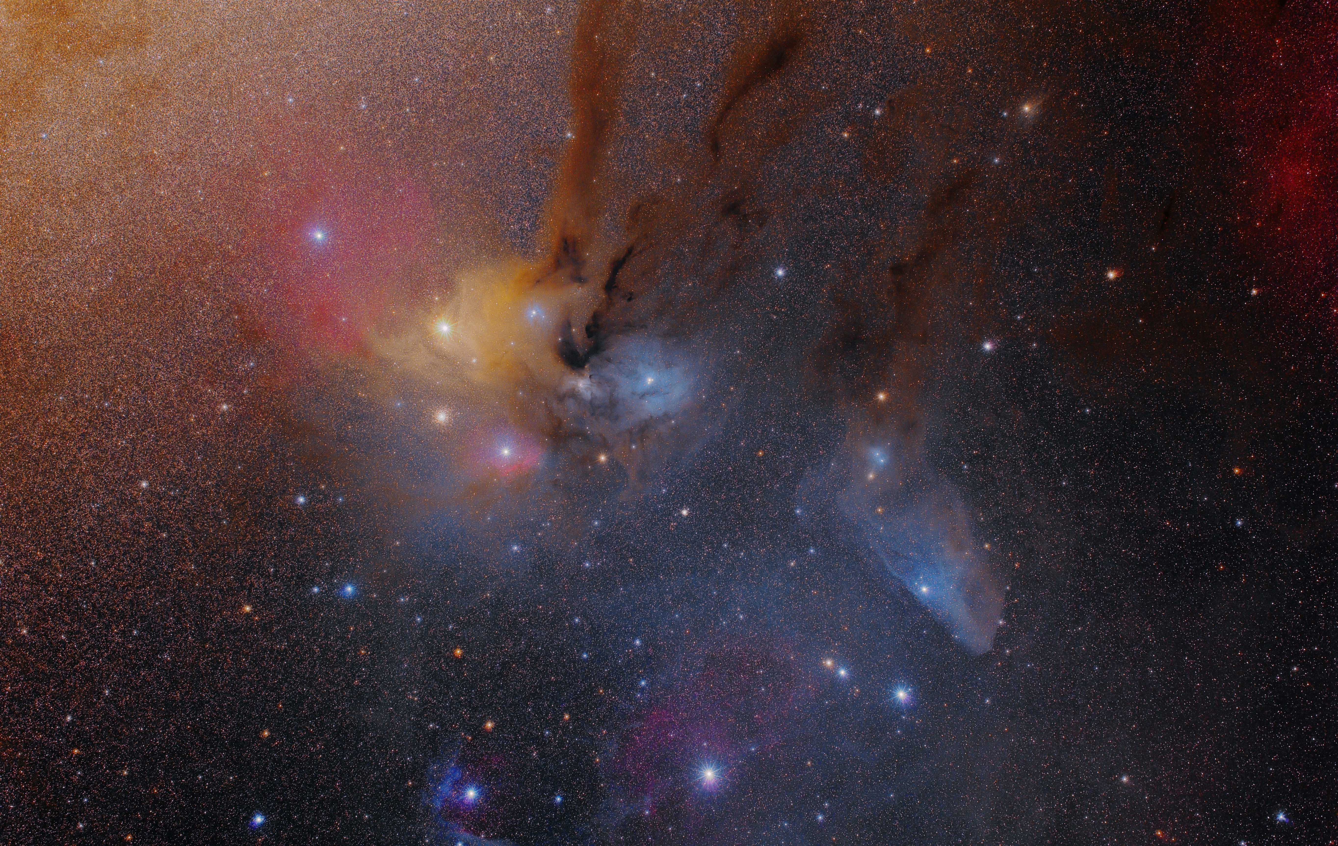 Der Rho-Ophiuchi-Komplex an der Grenze der Sternbilder Skorpion und Schlangenträger (Ophiuchus) ist auch für "sehr kleine Instrumente" formatfüllend, äußerst farbenprächtig und abwechslungsreich.