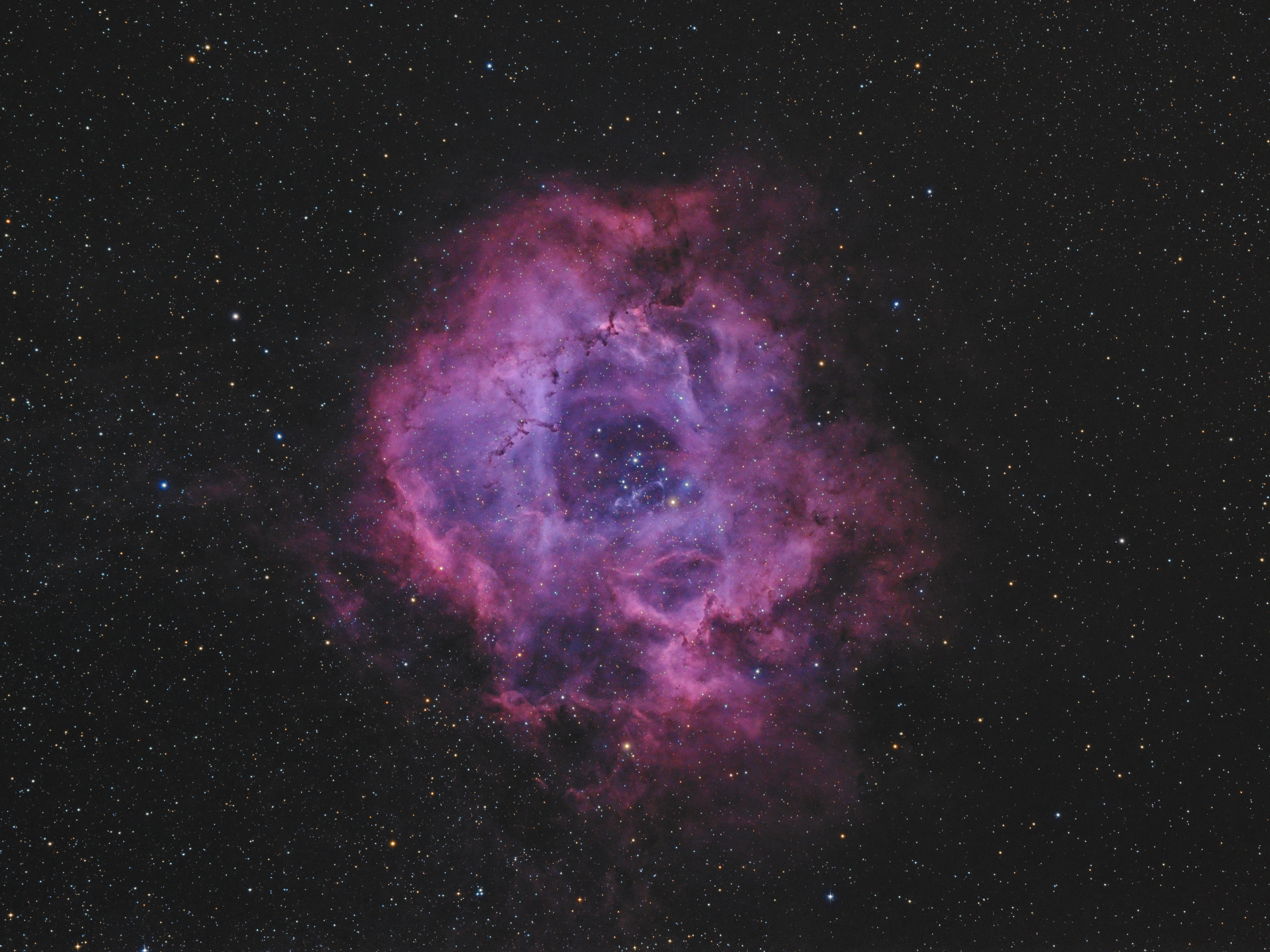 Der Rosettennebel NGC 2237 ist ein sehr beliebtes Motiv für Astro-Fotografen. Sehr kontrastreiche Ergebnisse kann man erzielen, wenn man in der Bildbearbeitung eine Schmalbandaufnahme (H-Alpha) als Luminanzebene (Helligkeitsinformation) definiert und nur die Farbinformation aus dem RGB-Bild übernimmt.