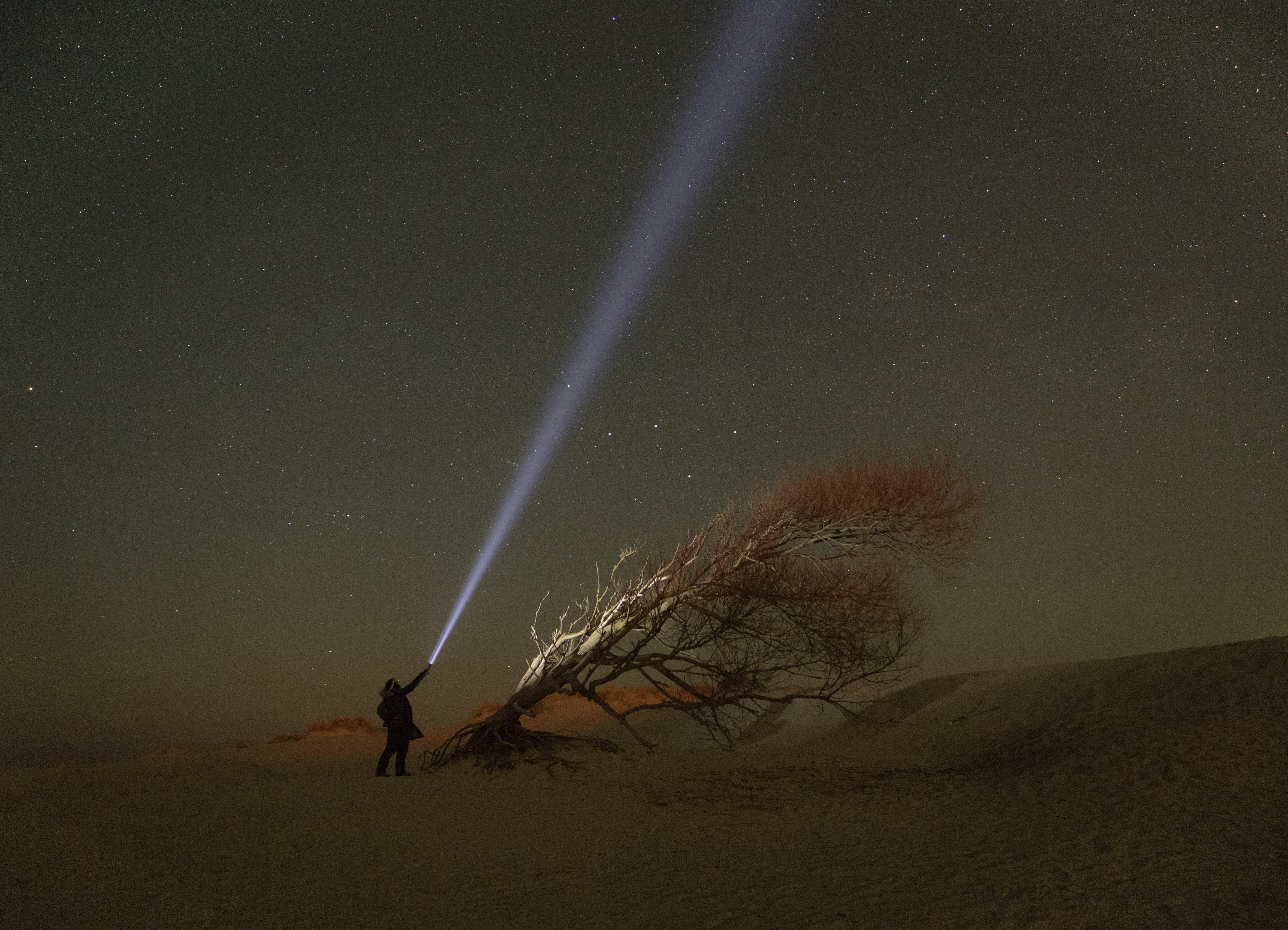 Dieser Tage fiel mir vor den Dünen am Nordstrand von Borkum ein einsamer Baum auf, der gerade noch den stürmischen Nordseewinden zu trotzen scheint. Ein ideales Motiv für die Nacht! Eine Stunde nach Mitternacht werden die hellen Lampen an der Promenade ausgestellt und so startete ich an kurz nach ein Uhr ein kleines Fotoshooting mit dem schiefen Baum von Borkum. Hier richte ich meine Taschenlange denau auf den Eta-Stern im Sternbild Kassiopeia, das direkt über dem Baum zu stehen schien. Aufgehellt wurde die Szenerie nur durch die nautischen Lichtsignale von der Nordsee-Seite und der Leuchttürme – und meiner Taschenlampe.