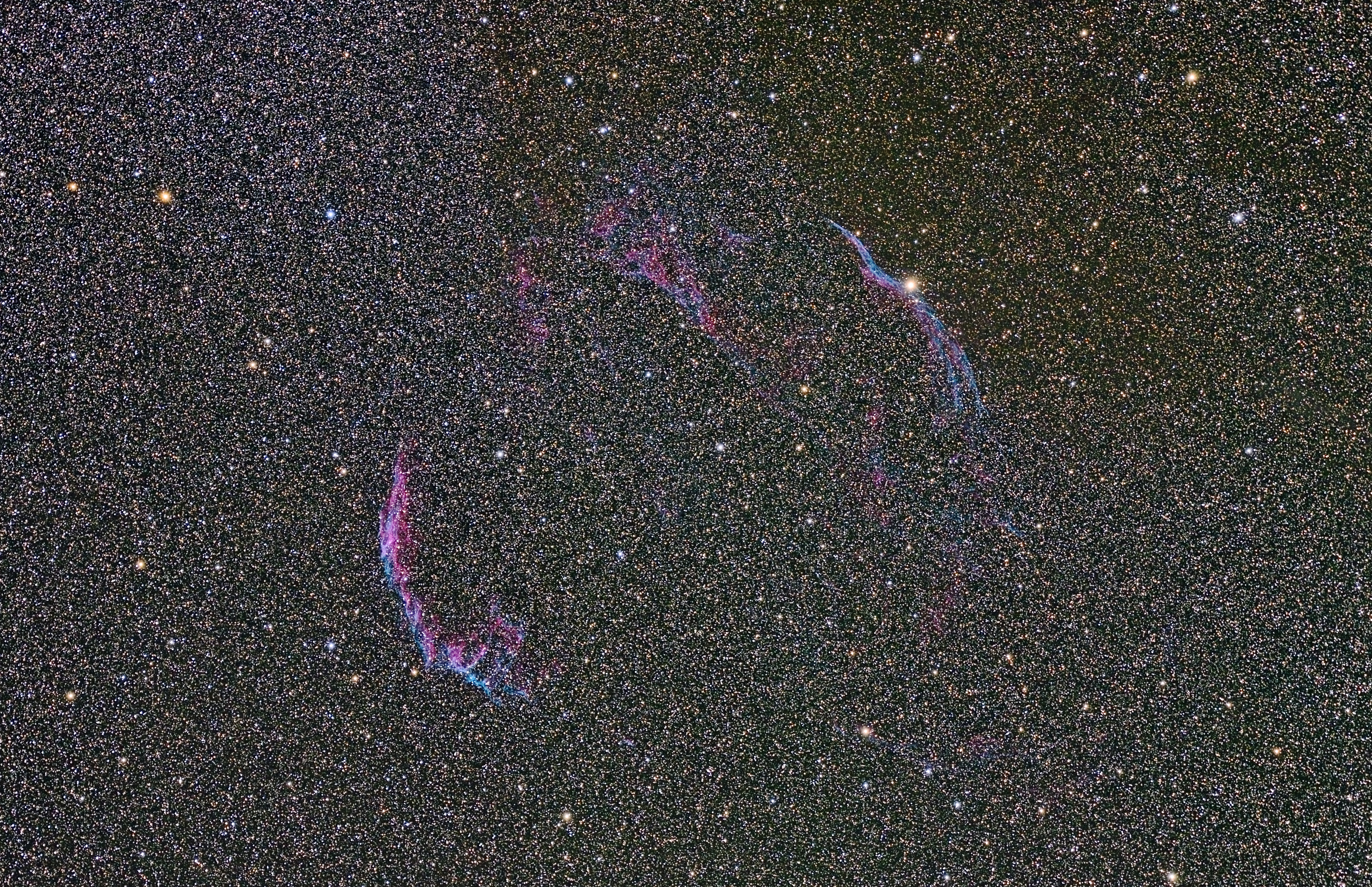 Diese wunderschöne, zarte Struktur - auch Cygnusbogen genannt - findet man im Sommersternbild Schwan. Dabei handelt es sich um die expandierenden Überreste einer Supernova, die sich vor mehr als 8000 Jahren ereignet haben muss. Die Filamente von geschocktem Gas bestehen aus atomarem Wasserstoff und Sauerstoff, welche rot und bläulich leuchten. Stack aus 30 Aufnahmen zu je 4 Minuten. Aufgenommen mit der Nikon D750 (unmod.) und einem AF-S 200-500 mm bei 300 mm Brennweite, Blende f/5,6 und ISO 1600. Tracking mit Astrotrac. Gerne hätte ich noch länger belichtet, jedoch hat das Wetter leider nicht mitgespielt. Die erste Bearbeitung macht aber definitiv Lust auf mehr…!