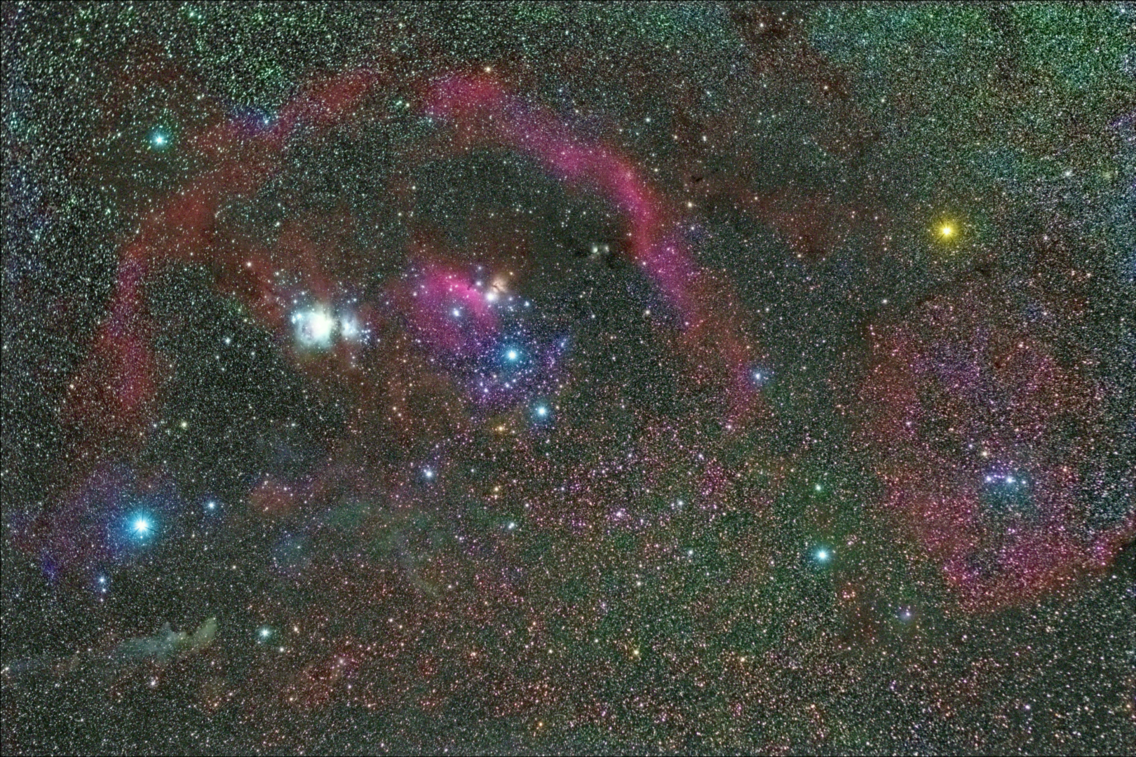 Der Orion ist eines der bekanntesten Sternbilder des Nachthimmels. In der chilenischen Wüste erscheint der Himmelsjäger bei Auf- und Untergang wie ein Schmetterling, der über den Himmel fliegt. Bei längerer Belichtungszeit macht sich auch die Farbenpracht dieser Konstellation, ähnlich der eines Schmetterlings, mit ihren bläulich schimmernden massereichen Sternen und rötlich leuchtenden H-II-Regionen bemerkbar.