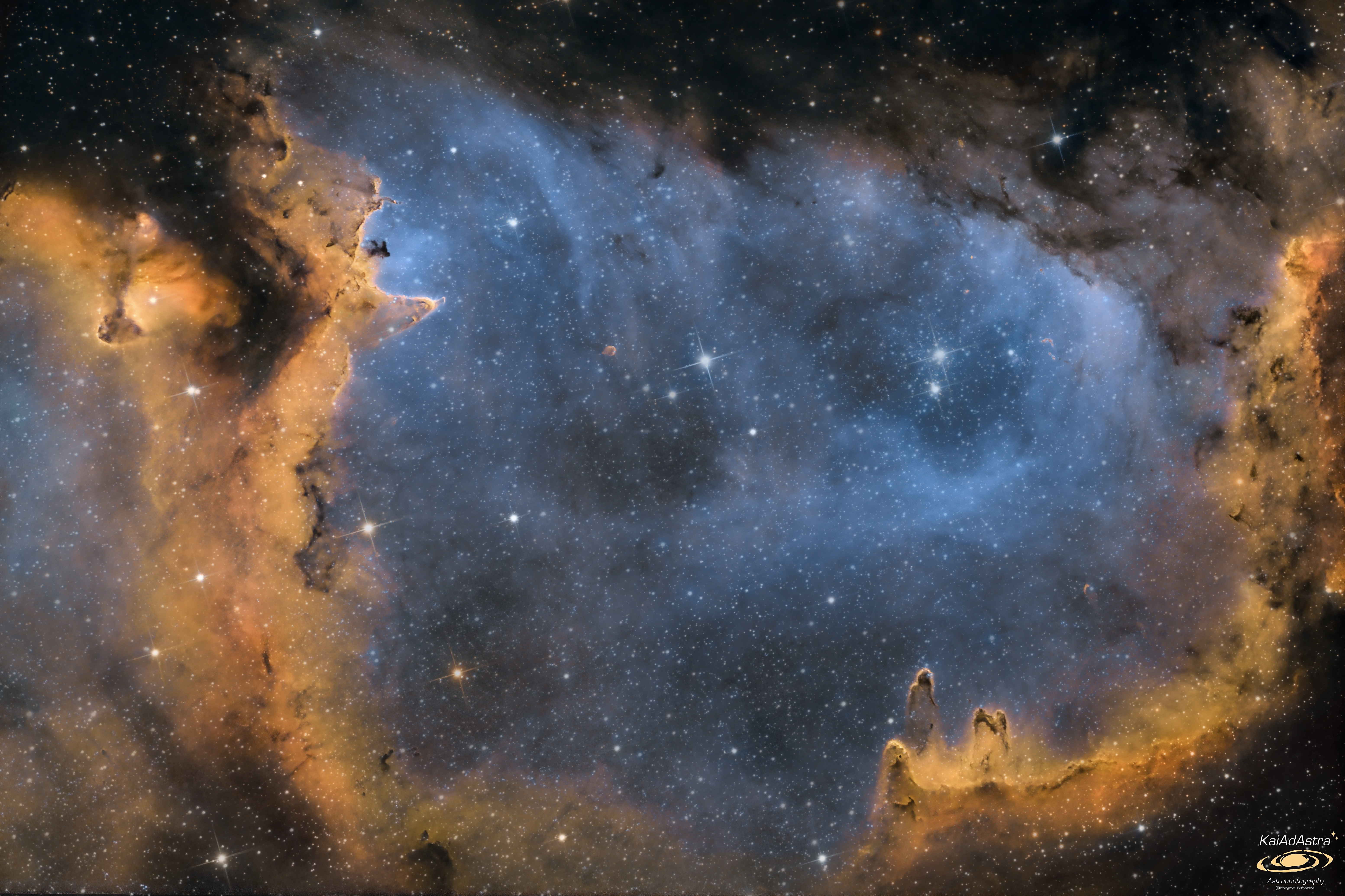 Den Seelennebel oder auch IC 1848 genannt, findet man im Sternbild Kassiopeia. Er ist der Nachbar vom Herznebel und etwa 7500 Lichtjahre von unserer Erde entfernt im Perseusarm unserer Milchstraße. Aufgenommen mit einem Dual-Schmalbandfilter für H-Alpha und OIII-Emissionslinien. Für die Sternfarben wurden RGB-Aufnahmen erstellt und anschließend als RGBHOO entwickelt.