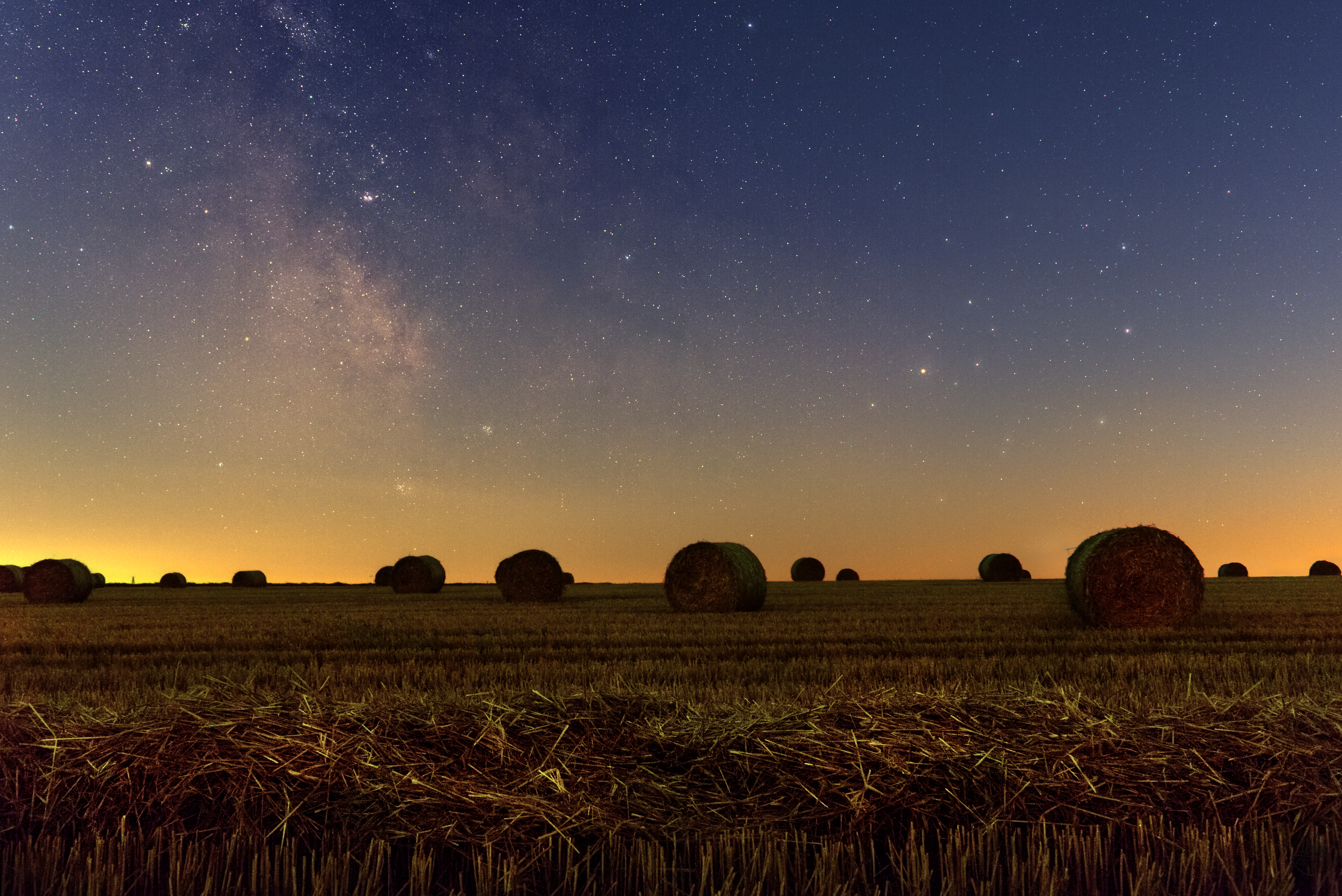 Der Sommer ist vorüber, die Ernte auf den Kornfeldern des Hunsrücks eingefahren. Zurück bleiben Stoppelfelder mit zahlreichen Strohballen. Für Landschaftsfotografen alle Jahre wieder ein lohnendes Motiv. Auch in der Nacht. Auf diesem Bild zeigen sich gleich zwei typische Sommermotive. Zum einen eine sommerliche Kulturlandschaft nahe der Gemeinde Baldringen im Naturpark Saar-Hunsrück und zum anderen der eindrucksvolle sommerliche Sternenhimmel mit dem Zentrum der Milchstraße und dem Kopf des Sternbilds Skorpion. Dessen Zeit auf der Himmelsbühne ist nun abgelaufen. Nur noch am frühen Abend zeigt sich Antares, der rötliche Hauptstern des Stacheltieres knapp über dem Südwesthorizont. Schon nach Einbruch der Nacht steht das Sternbild so tief, dass seine Beobachtung wenig Sinn macht. So entstand diese Aufnahme auch in der astronomischen Dämmerung mit seinem natürlich- bläulichem Himmelshintergrund. Obwohl es noch nicht völlig dunkel ist, zeigt sich das Zentrum der Milchstraße mit dem Sternbild, dessen Stachelspitze noch gerade so über dem Horizont zu erkennen ist.