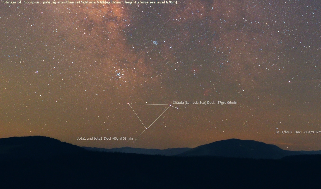 Obwohl ich den Südhimmel von Aufenthalten in Namibia und meiner zweiten Heimat, den Philippinen, gut kenne, und davon unzählige Aufnahmen gemacht habe, suche ich hier einen höheren Platz auf, um so tief wie möglich in den Südhimmel hinabzusehen. Der ganze Skorpion ist in Mitteleuropa nicht zu sehen, wohl aber sein Stachel!