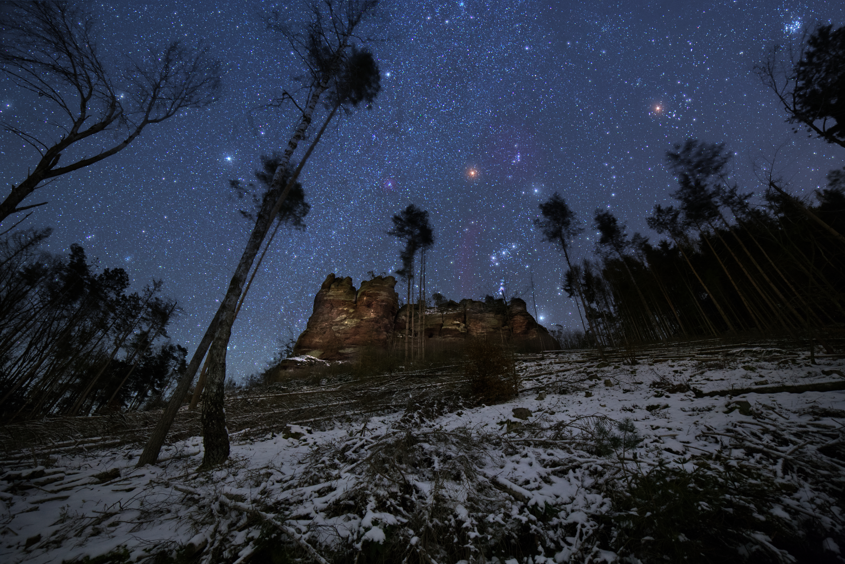 Er steht weithin sichtbar über dem Pinschbachtal. Der Altfels gilt als einer der Höhepunkte der Traumschleife »Kasteler Felsenpfad«, Bestandteil des Saar-Hunsrück-Steigs im Naturpark Saar-Hunsrück. Diese beeindruckende, über 30 Meter hohe Buntsandsteinformation, die vor 200 Millionen Jahren noch im Trias-Meer stand, bietet einen tollen Blick ins Saartal. Ja, er ist besteigbar, allerdings nur für wirklich mutige und absolut schwindelfreie Wanderer. Wer hier mit Höhenangst in den Felsen steigt, kommt nicht mehr runter. Aber keine Sorge: die Höhenrettung der Feuerwehr hätte hier nicht ihren ersten Einsatz! In dieser Nacht aber bin ich alleine unter zahllosen Sternen. Majestätisch ragt der Fels in den wolkenlosen, klaren Winterhimmel. Der Boden ist immer noch mit Schnee bedeckt. Das ist gut, das steigert den Kontrast in der ansonsten stockdunklen Nacht. Der Blick Richtung Süden und steil nach oben. Der Orion schafft es nur mit Mühe, sich über den Felsen zu schwingen. Der Himmelsjäger wird begleitet von den offenen Sternhaufen Hyaden und Plejaden im Sternbild Stier. Sein Hauptstern Aldebaran leuchtet genauso rötlich wie Beteigeuze, der rote Riesenstern am immer noch winterlichen Sternenhimmel.