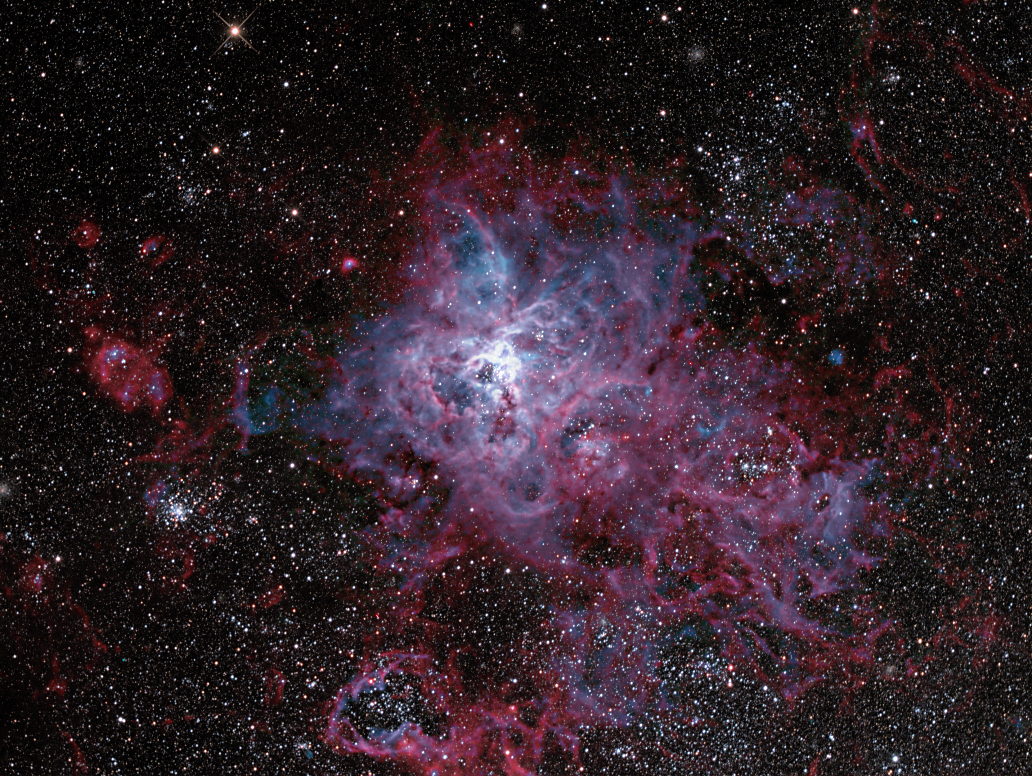 Bei einem Aufenthalt auf der Farm Tivoli in Namibia Anfang September 2013 entstand dieses Bild des Tarantelnebels, einer riesigen Sternentstehungsregion in der großen Magellanschen Wolke. Die Darstellung der H-alpha- und O-III-Emission (rot bzw. blau) der Nebelfilamente wurde durch Kombination mit Aufnahmen durch Schmalbandfilter verstärkt.
